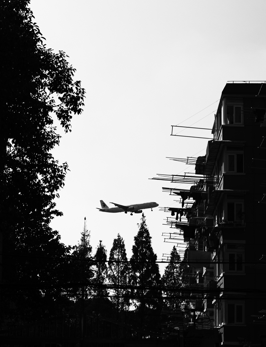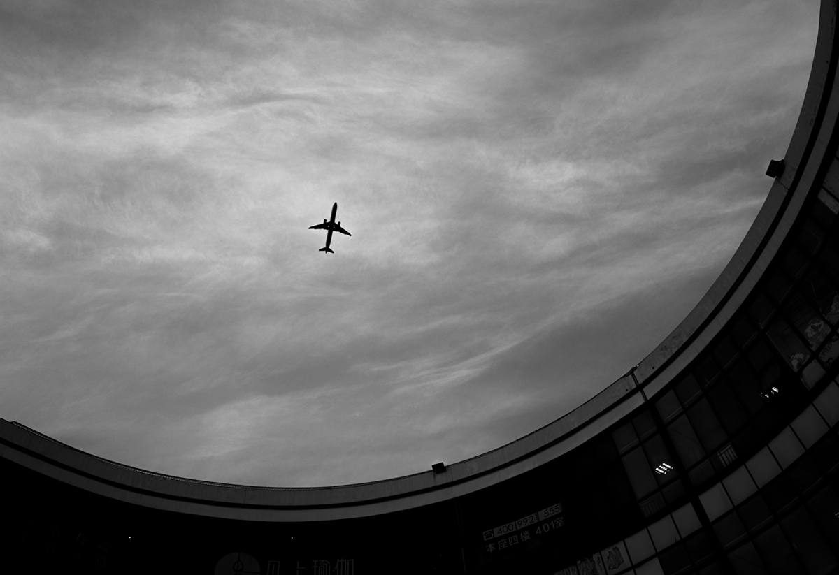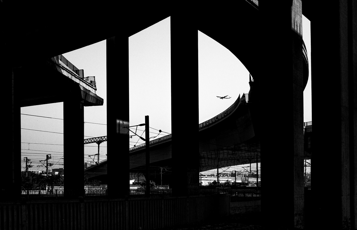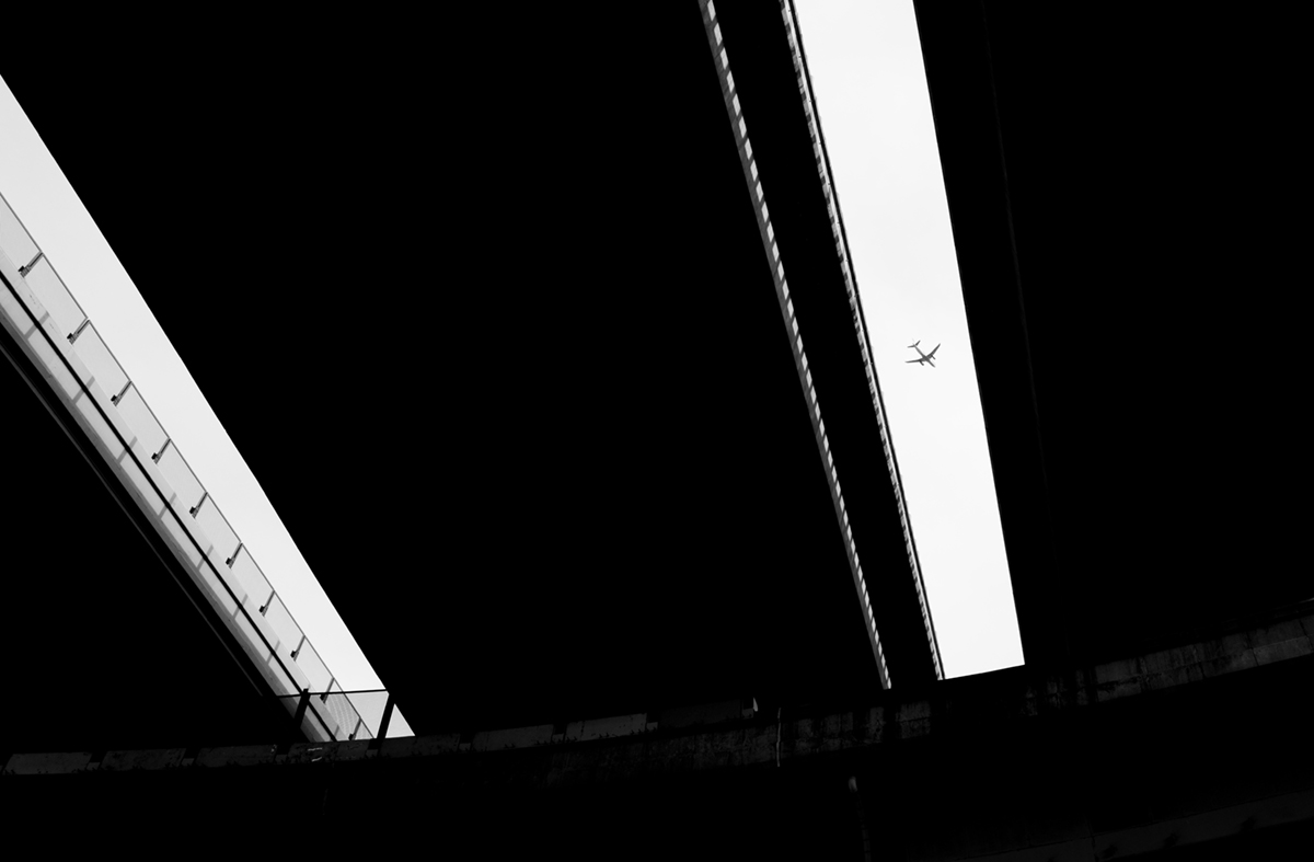 Living near an airport, I spent years capturing this series that deciphers the fleeting encounters between airplanes and urban structures. Rendered in a stark black-and-white palette, the work constructs a visual grammar where the sky is fractured into rigid geometries of steel and concrete. Within this framework, airplanes emerge as transient verbs—light, humorous, and surreal intrusions that punctuate the city's heavy, noun-like stillness. This tension between the mobile and the static invites a reflection on how freedom and chance compose their own syntax within the ordered sentences of modern life.