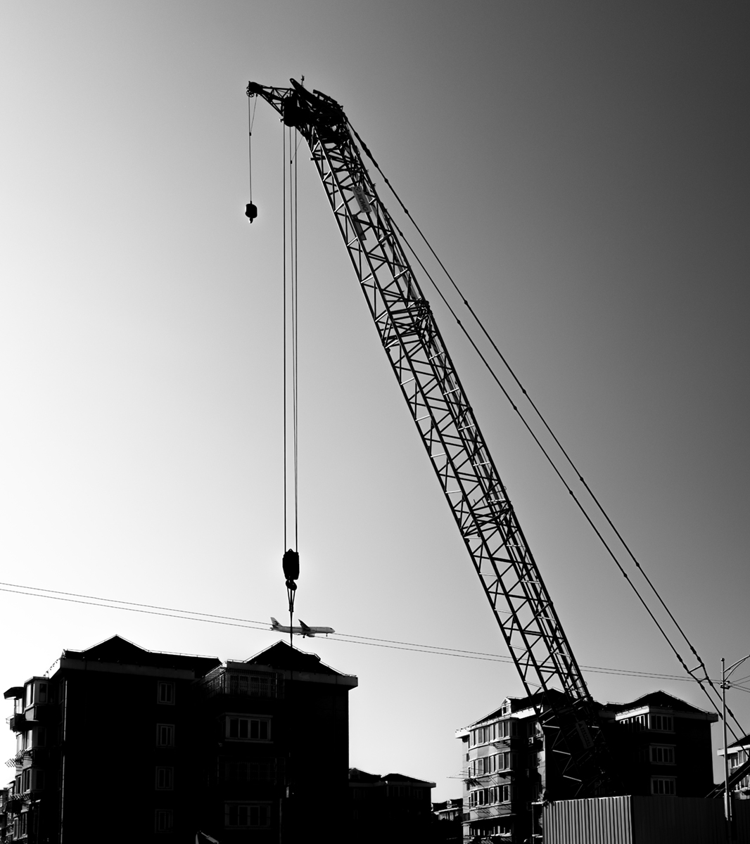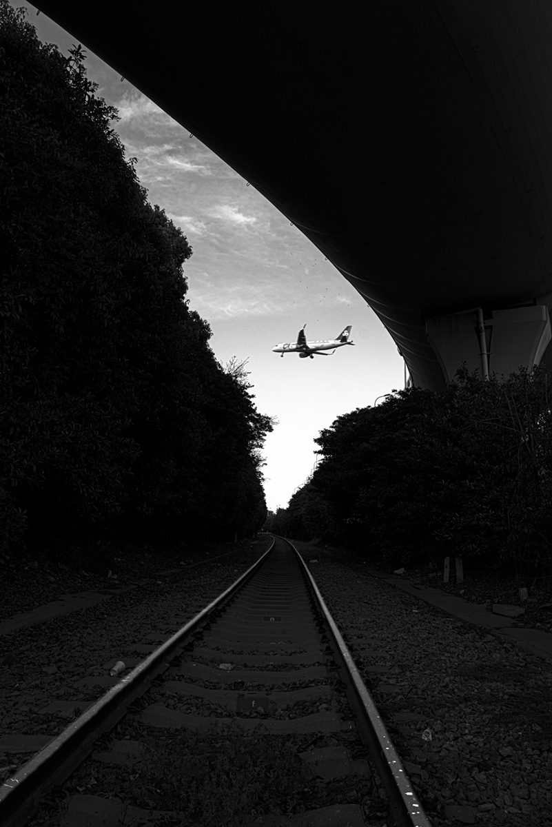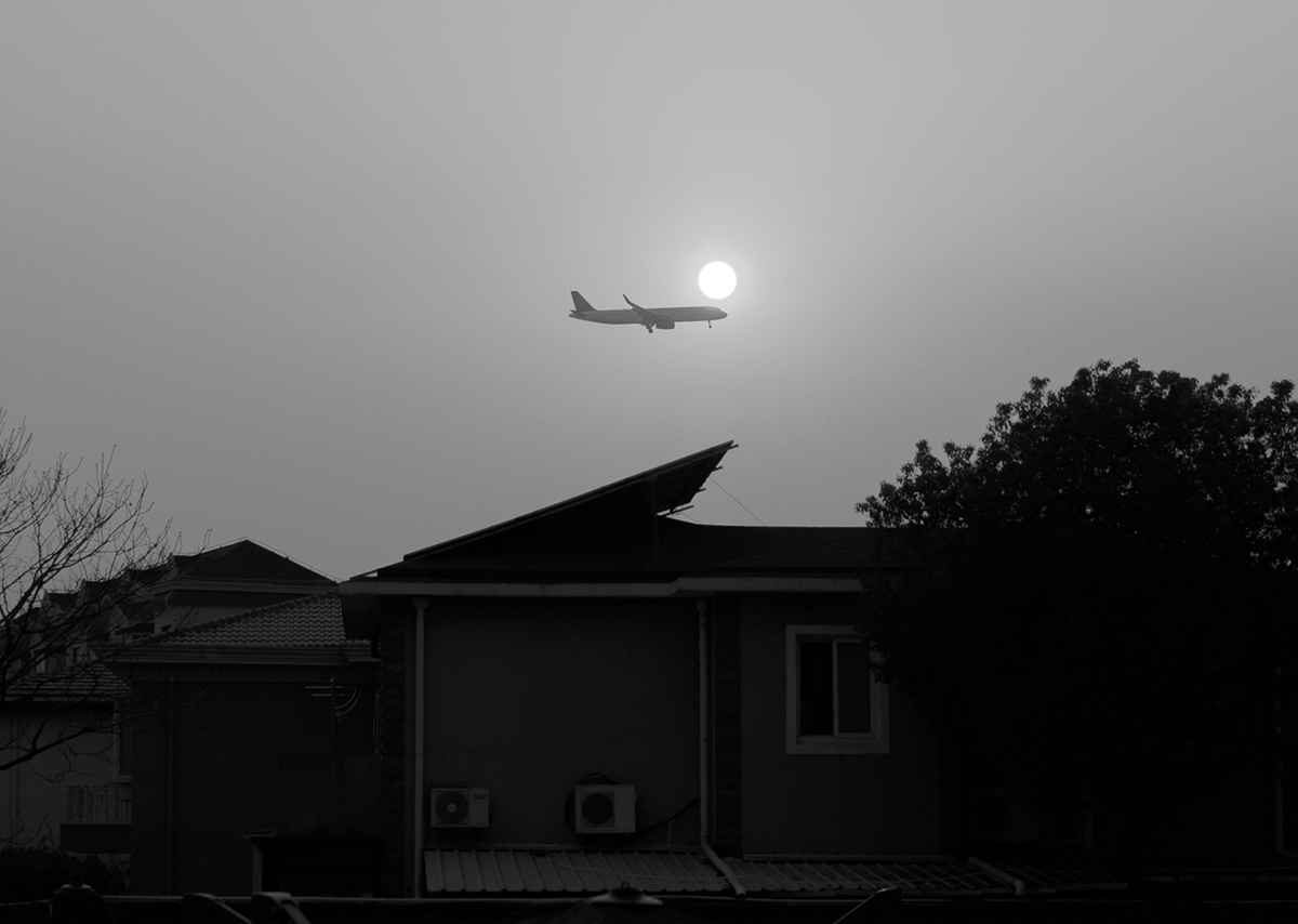Living near an airport, I spent years capturing this series that deciphers the fleeting encounters between airplanes and urban structures. Rendered in a stark black-and-white palette, the work constructs a visual grammar where the sky is fractured into rigid geometries of steel and concrete. Within this framework, airplanes emerge as transient verbs—light, humorous, and surreal intrusions that punctuate the city's heavy, noun-like stillness. This tension between the mobile and the static invites a reflection on how freedom and chance compose their own syntax within the ordered sentences of modern life.