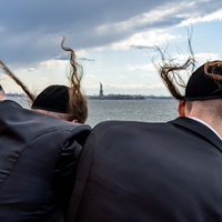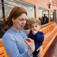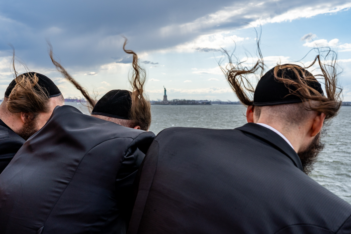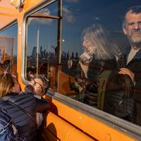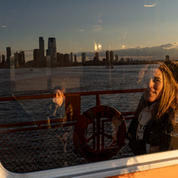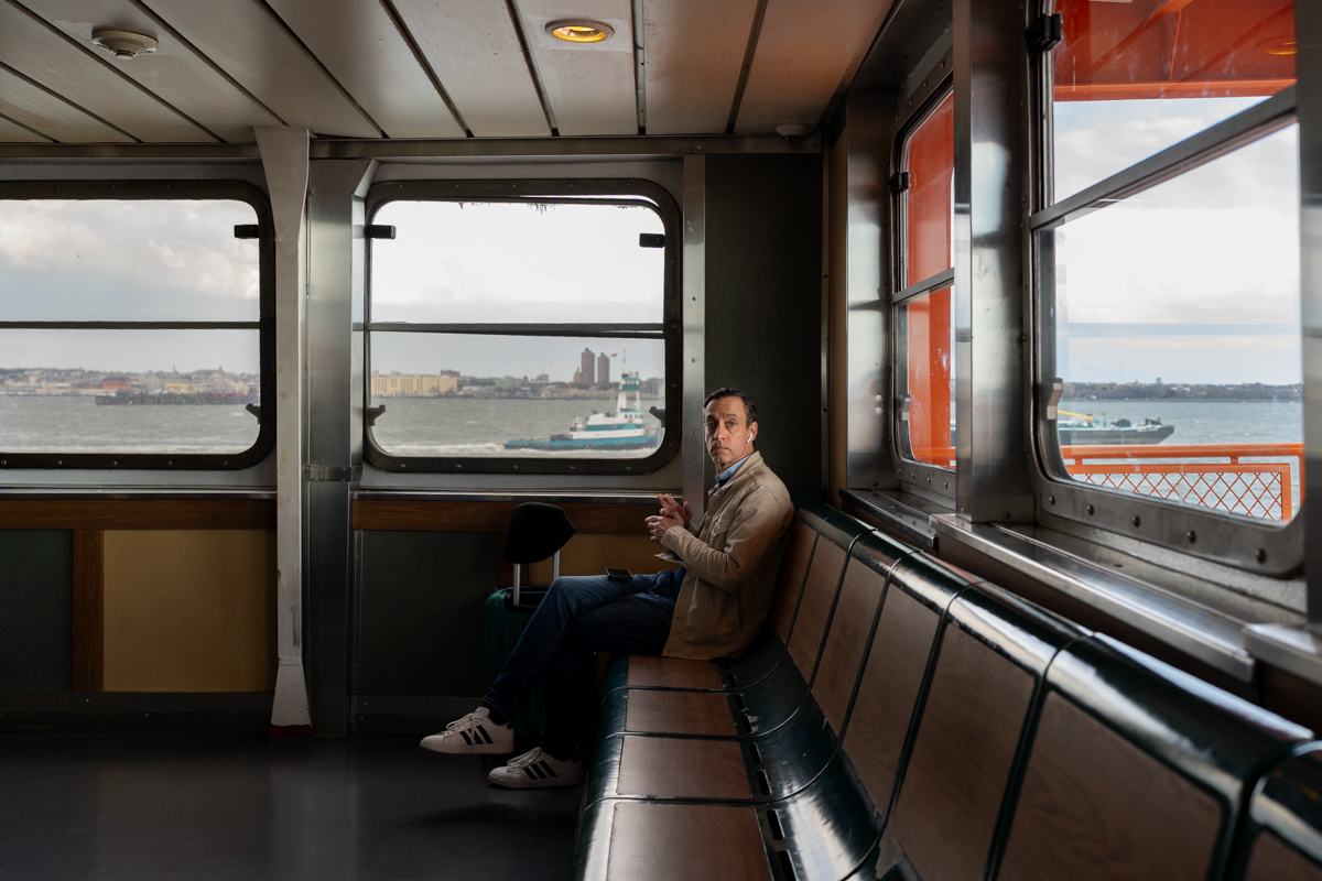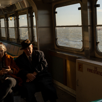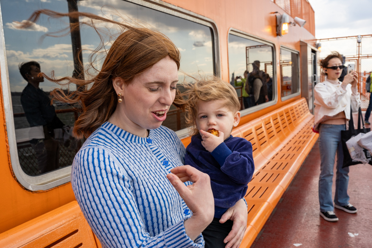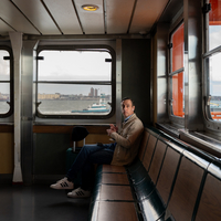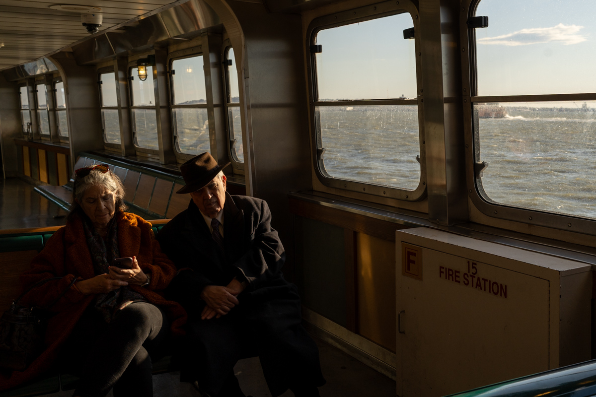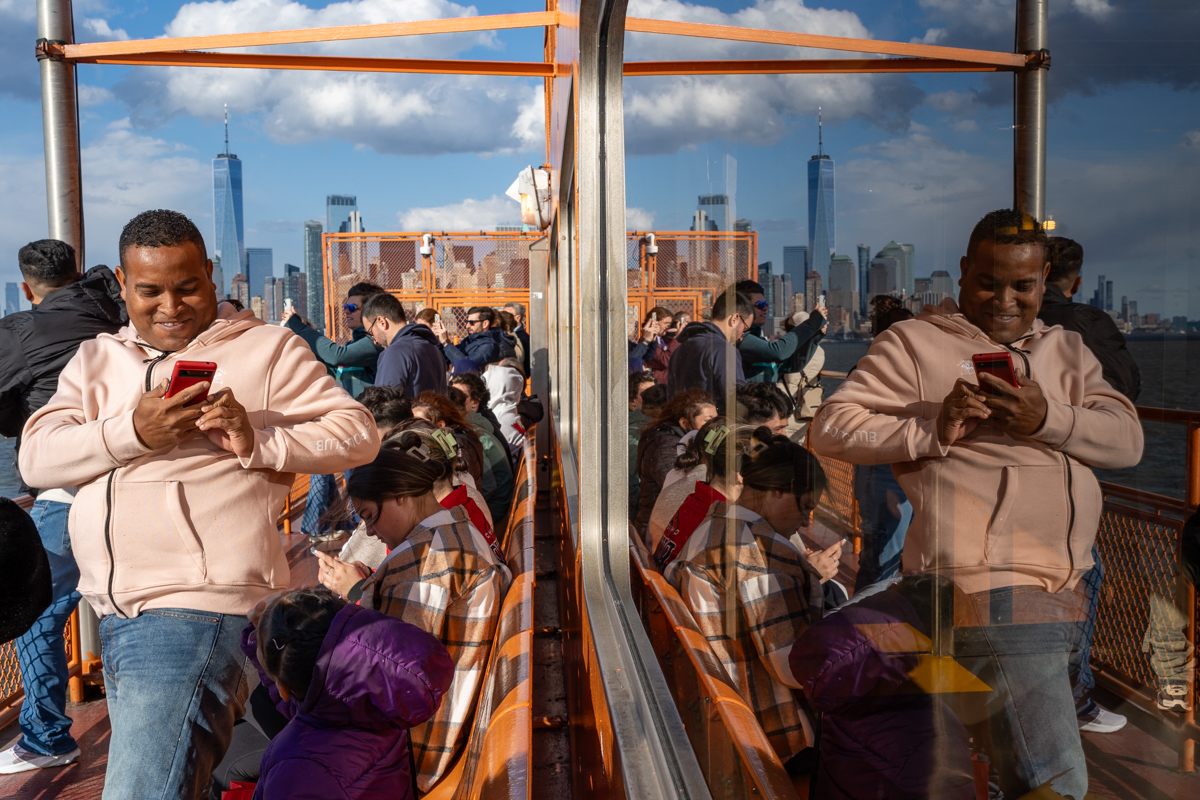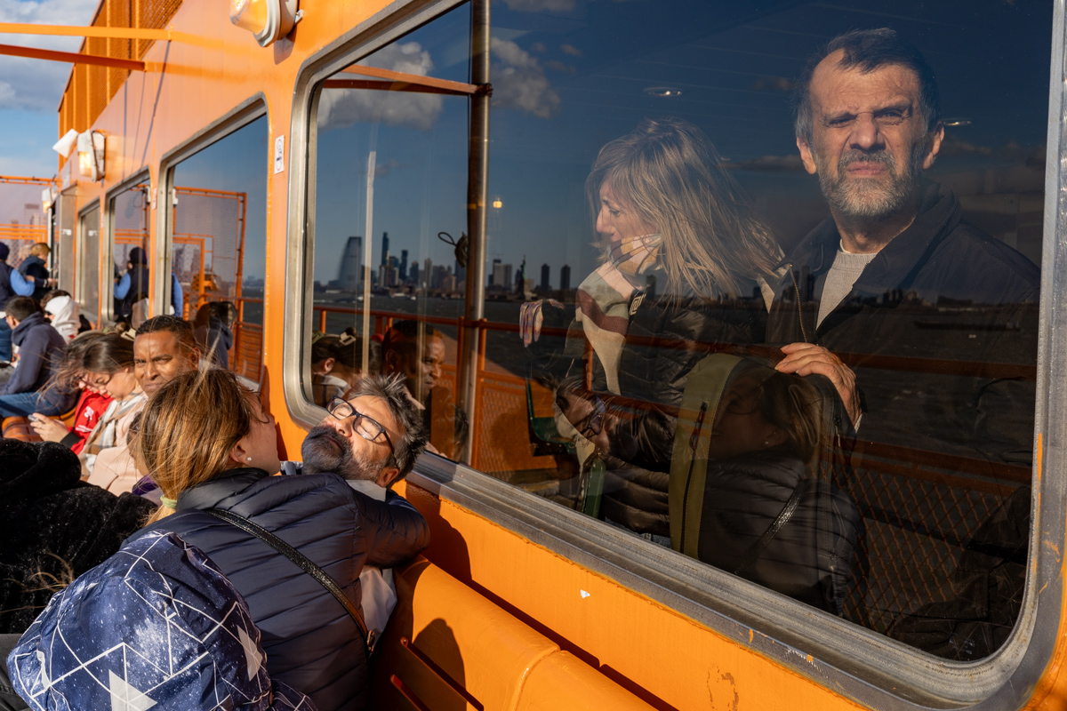 Daily life scenes of commuters in the Staten Island Ferry, a fare-free passenger ferry route operated by the New York City Department of Transportation. April 2025.