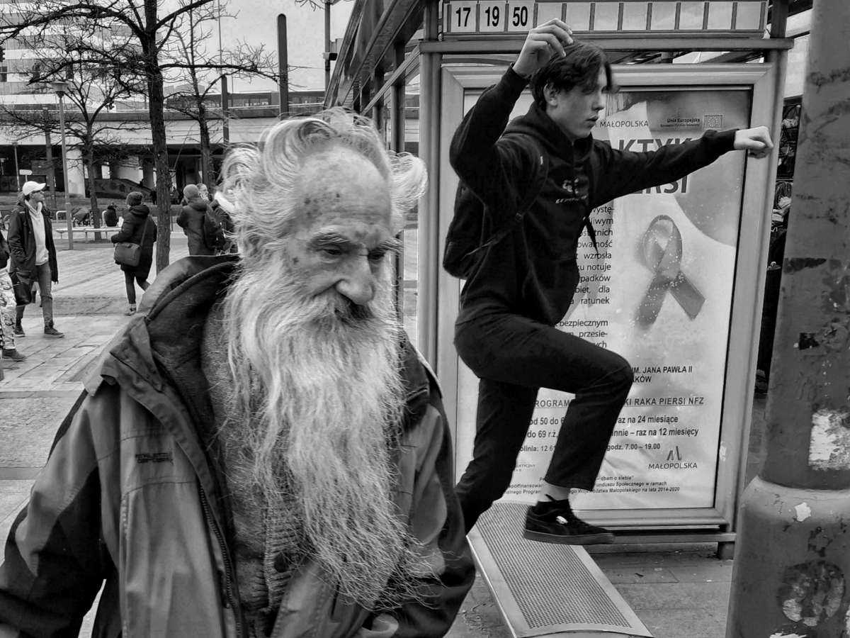 I love public transport. It's a lens that captures interpersonal relationships, but also the culture and social relations of the city. I've been collecting such portraits and situations on Krakow's tram stops for years.
