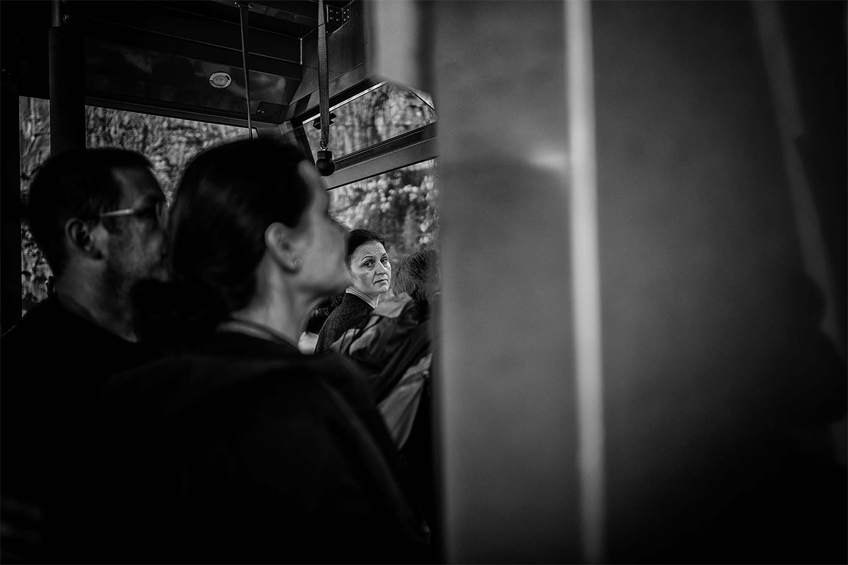 This photo series depicts people in an unexpected, extreme situation. These images capture the facial expressions, the turning away, the distractions, the silence, the discomfort, the behavior, the fear of people in a situation where intimate, personal, and social distances are vastly transgressed, indeed, cease to exist. In this extreme situation, even the photographer's camera goes unnoticed, making it possible to capture these 14 minutes of gondola ride with intense and emotional images.To present this moment unvarnished and authentically, the images are shown in black and white to reduce the focus to the subject matter.