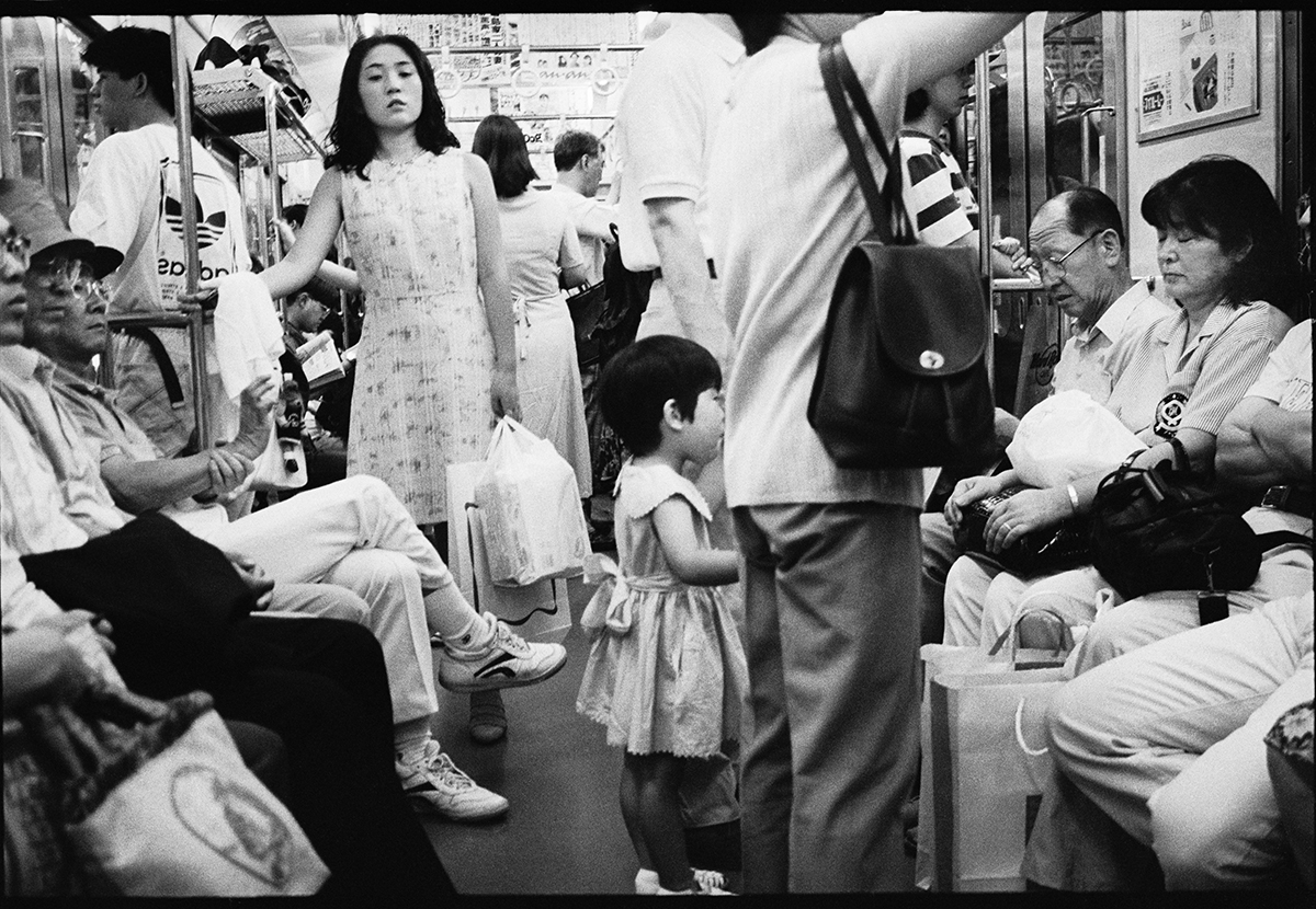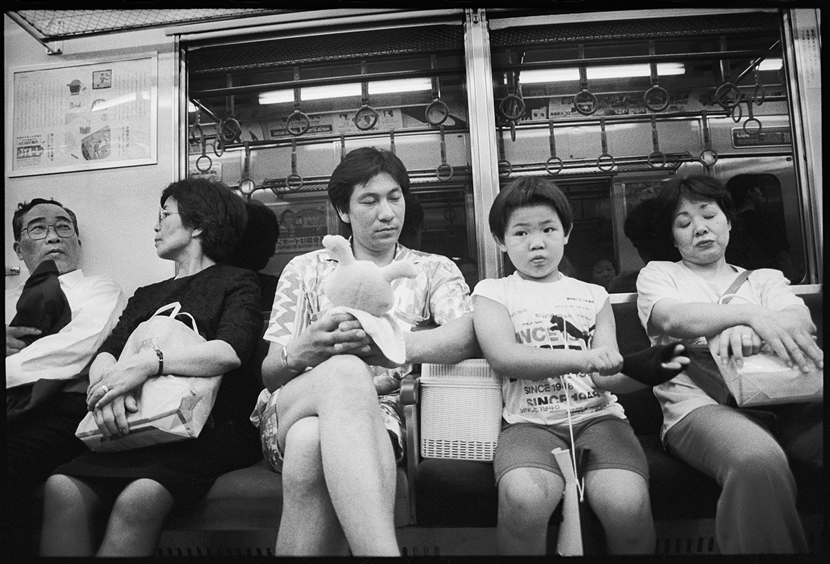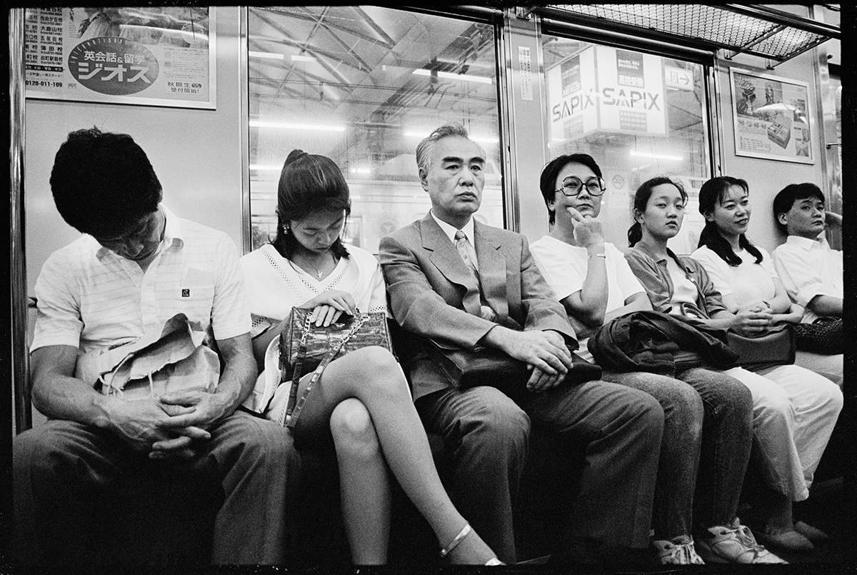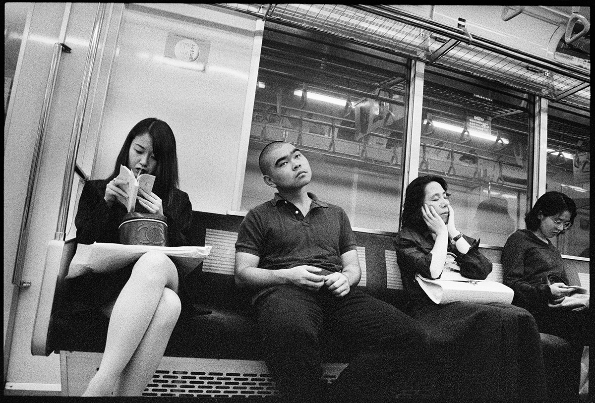 This series began as a student’s exploration of Japan in the mid-1990s, a moment shaped by the “Lost Decade” and the lingering unease following the 1995 subway sarin attack. Shot on black-and-white film, the photographs follow the understated choreographies of everyday commuters—glances, gestures, and the small acts of retreat that shape public life.