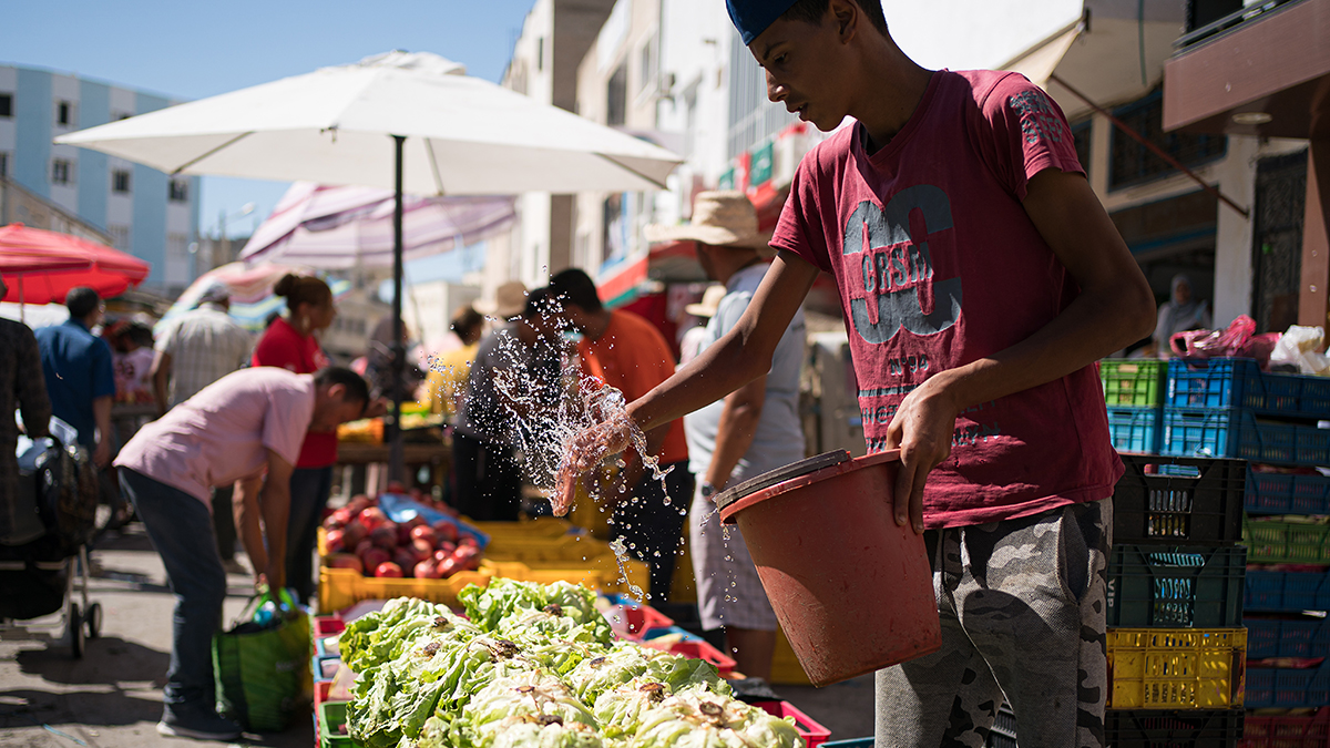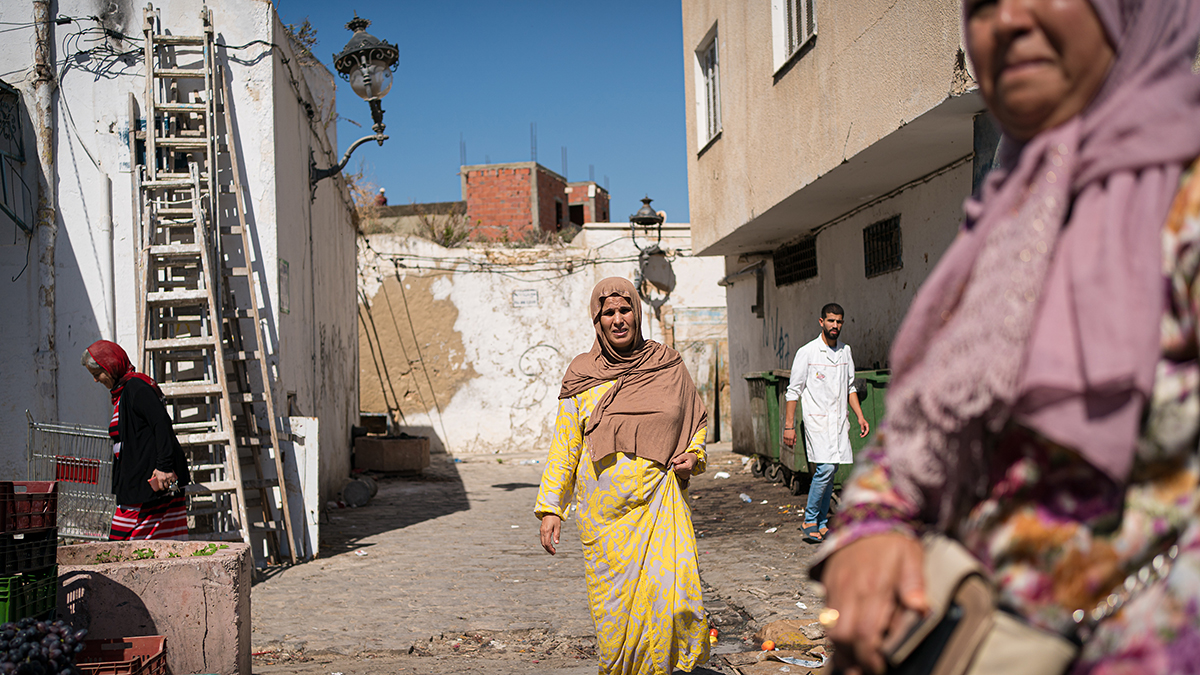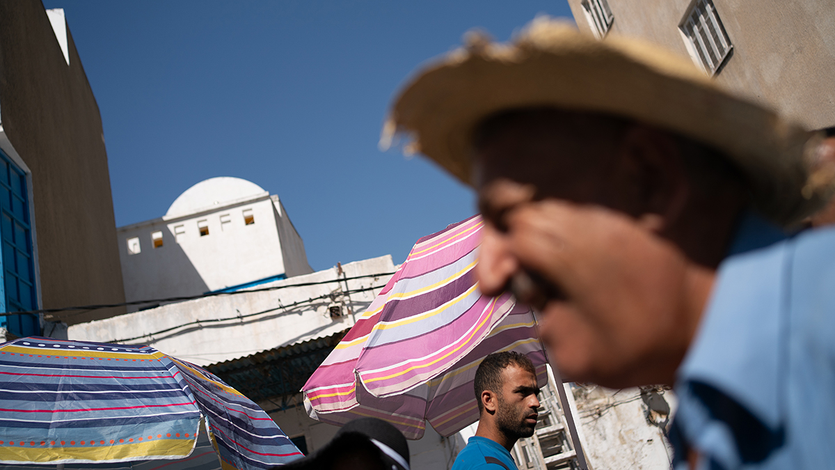 Market captures the bustling life of a Tunisian marketplace, where lives meet, intertwine, and sometimes collide in a continuous flow.