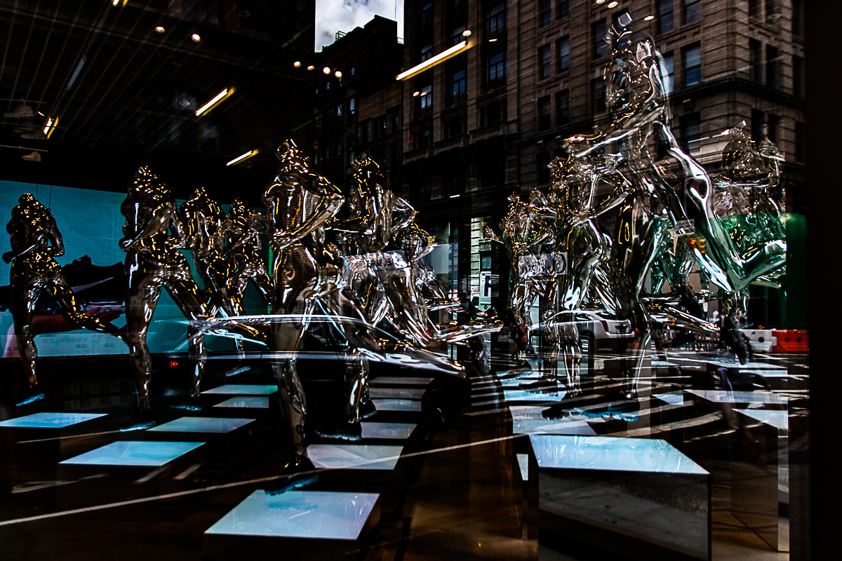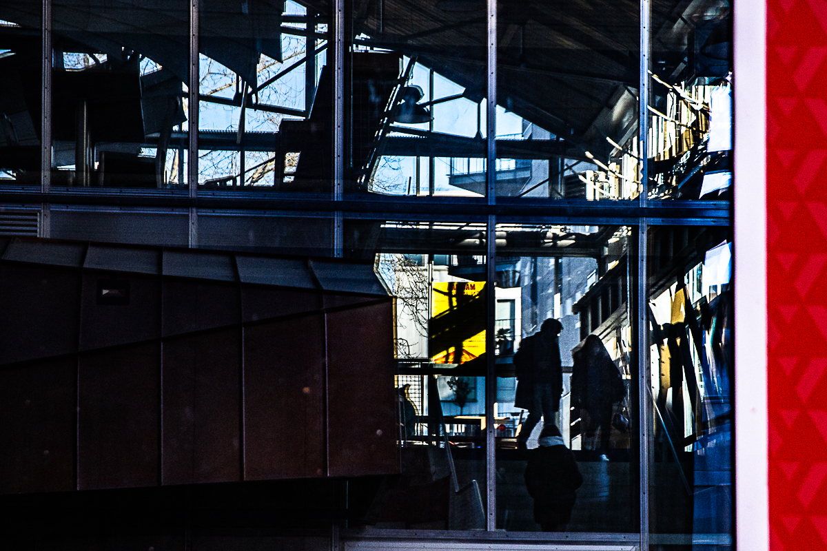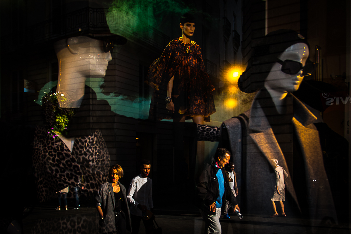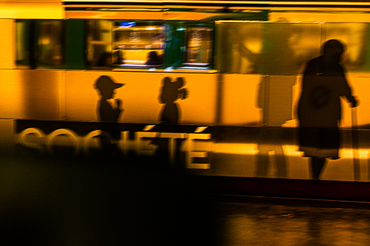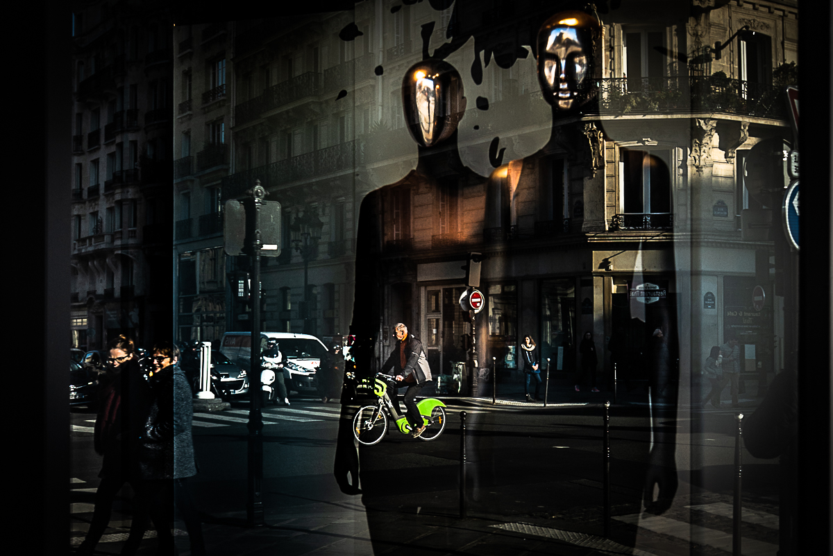 FR: Capturés par la lumière et reflétés sur le verre, les reflets de la ville révèlent un monde fragile et onirique. Ici, la réalité se dissout, mêlant la présence humaine à l'architecture -- une vision d'une ère nouvelle où les frontières entre l'homme et la machine s'effacent.