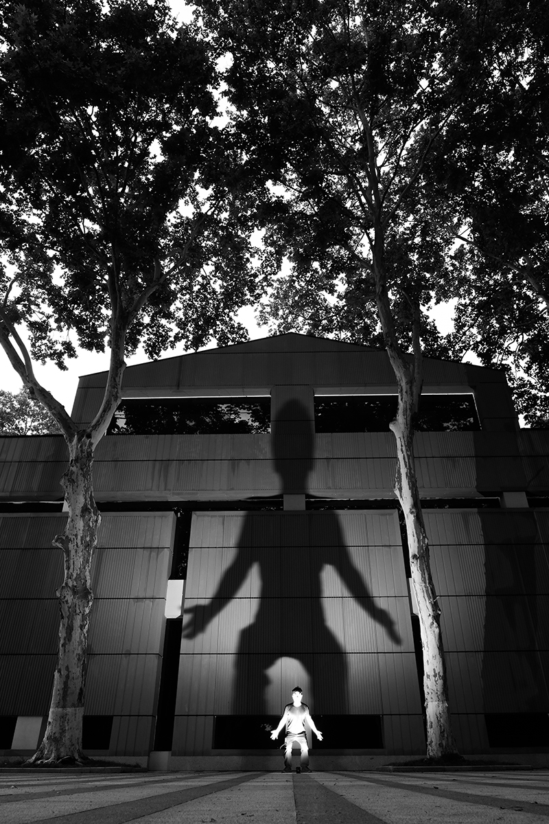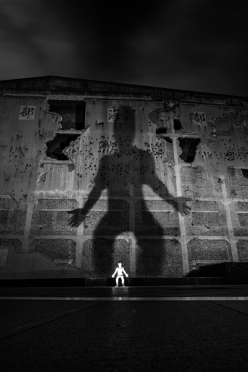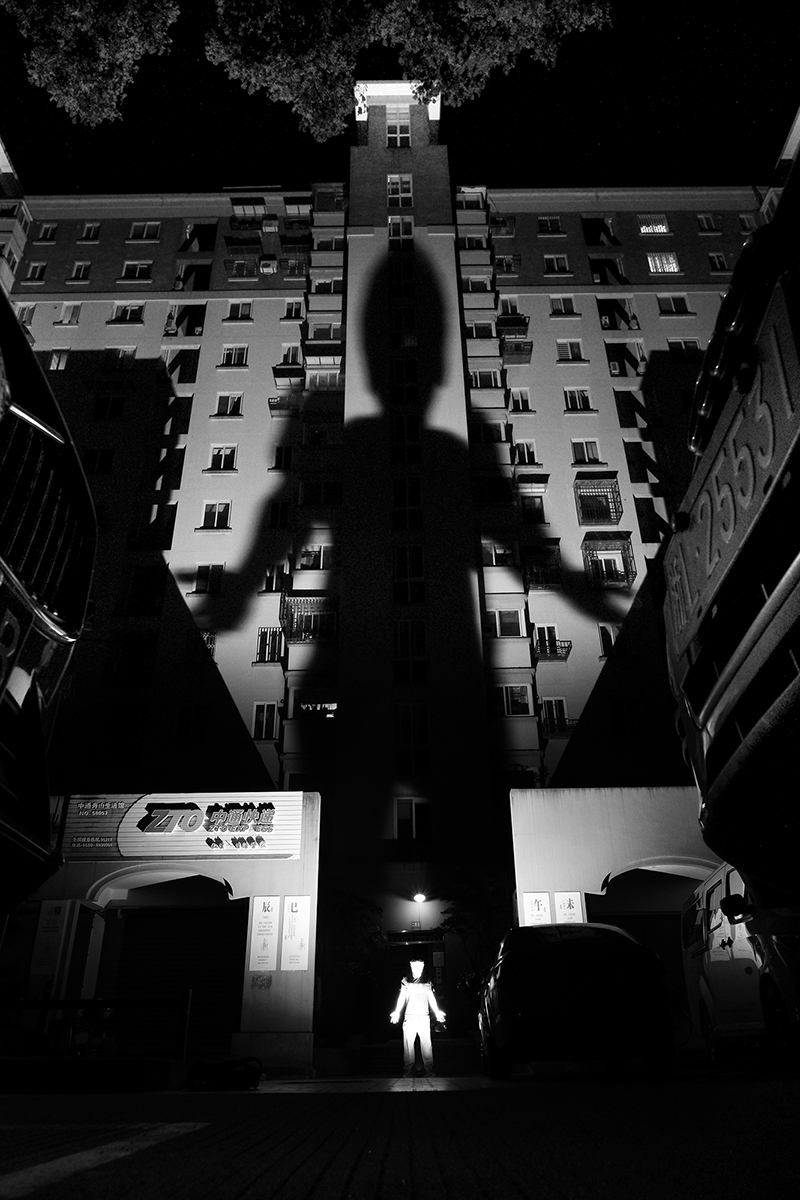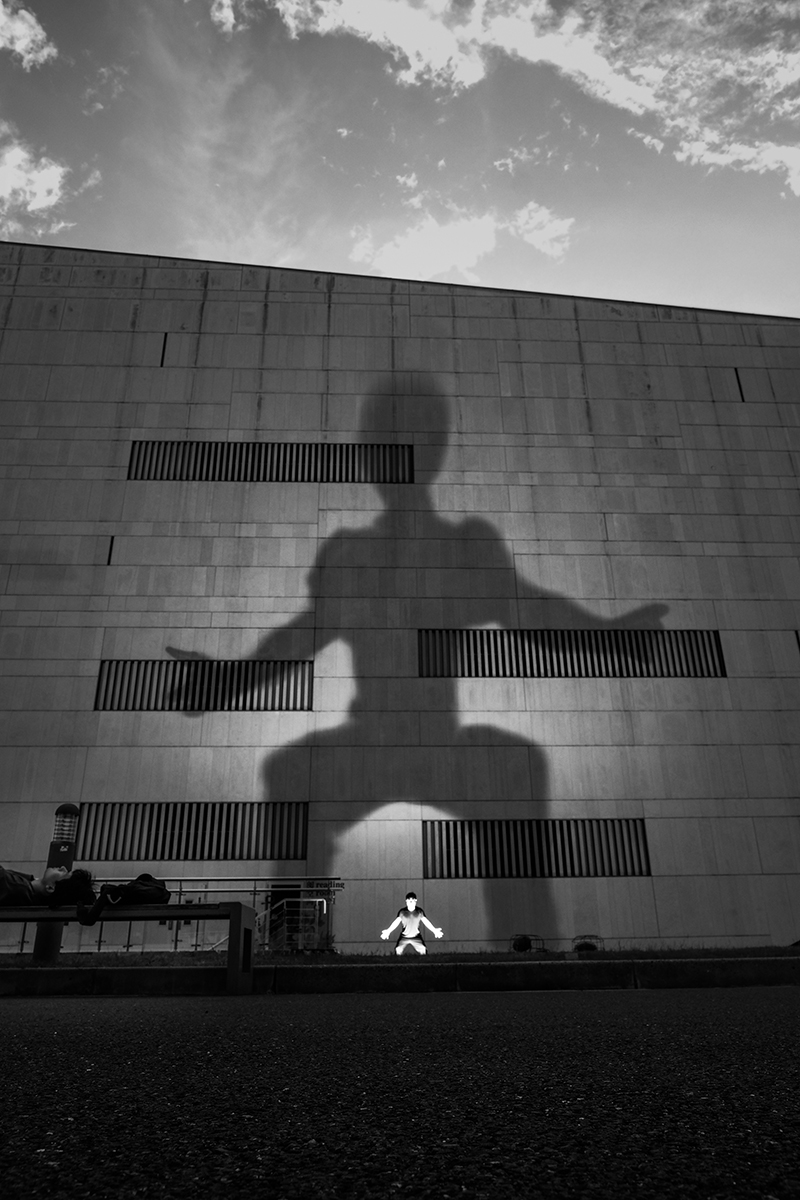 About a year and a half ago, I began working on my street photography project The Giant Shadow of the Human World. The technique involves placing a flash on the ground and capturing my own shadow on a wall, creating a striking visual contrast between the subject and its shadow. Off-camera flash combined with a public space wall forms an enormous shadow. This technique is not only innovative in form but also focuses on "creating visibility" — I am not recording shadows; I am "creating shadows," using light to carve a layer of identity/symbolism onto the human body.