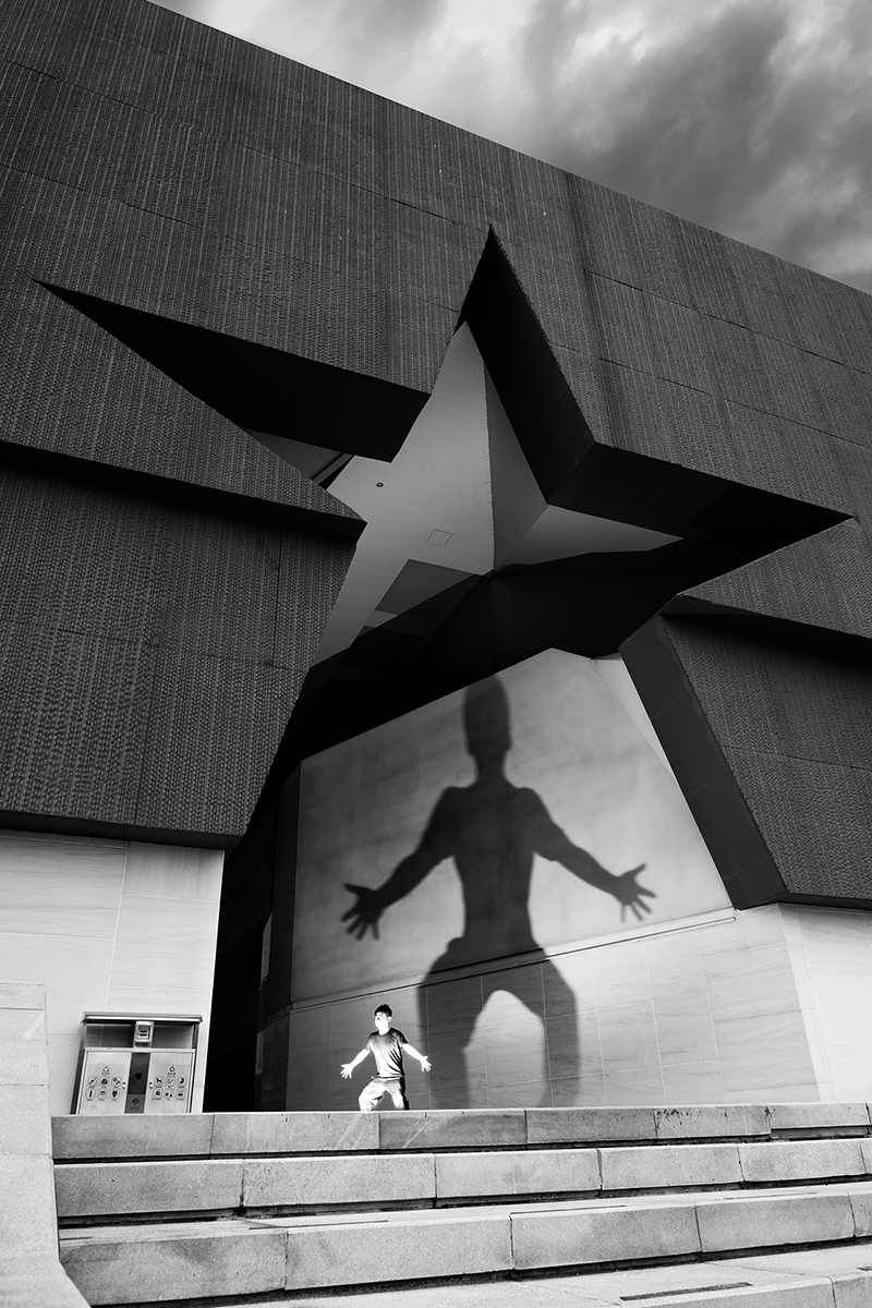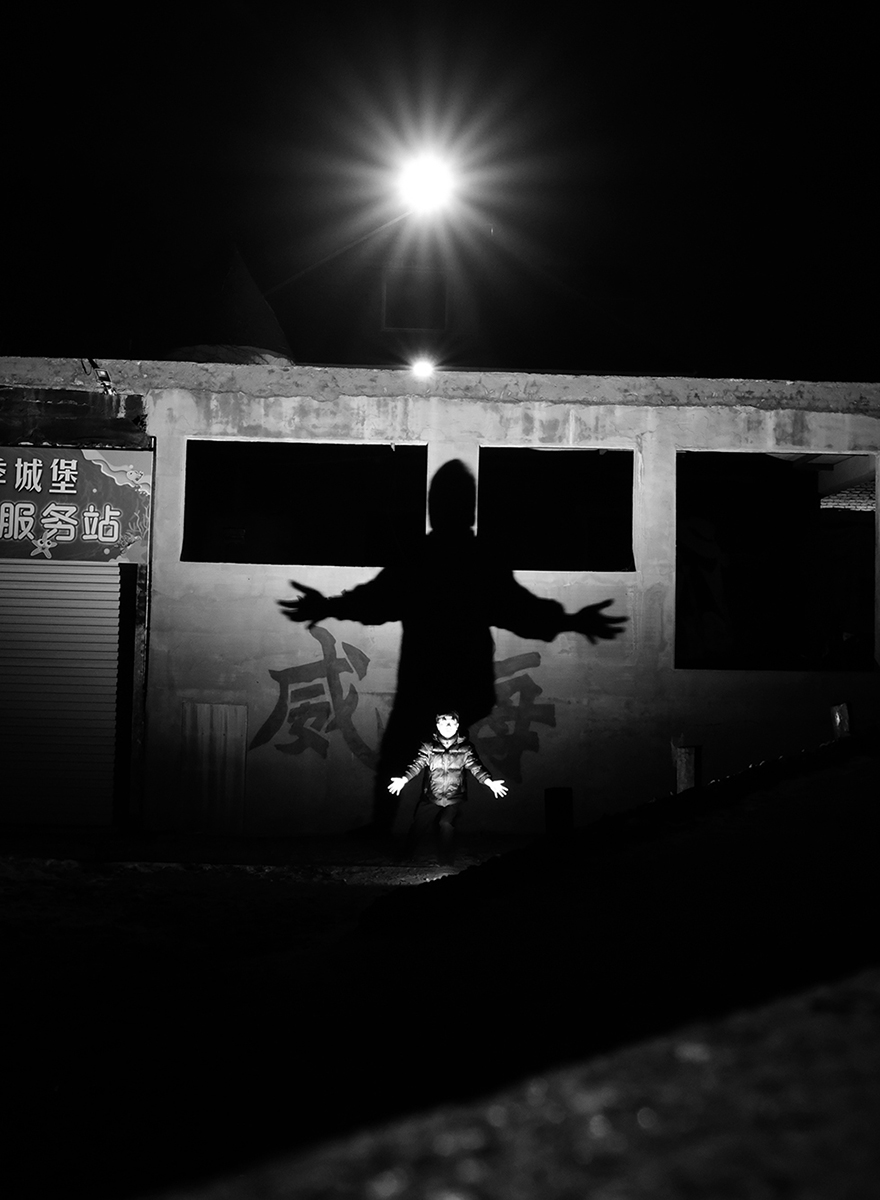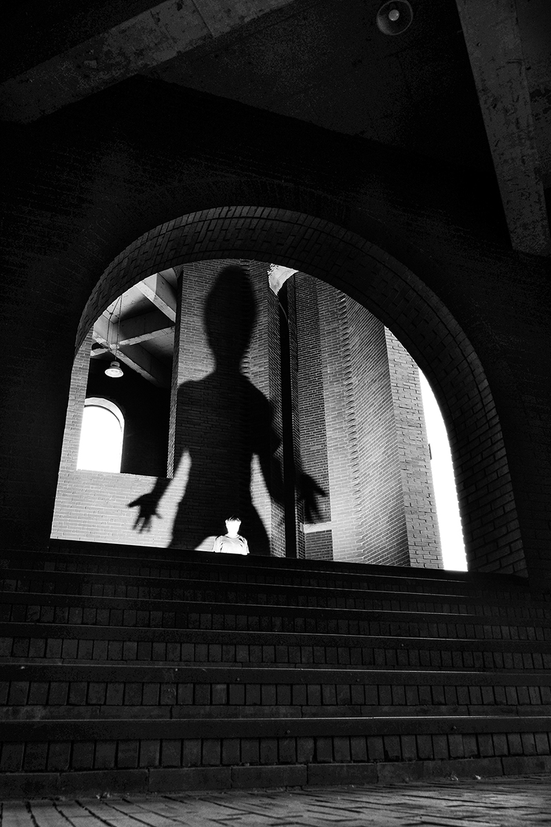 About a year and a half ago, I began working on my street photography project The Giant Shadow of the Human World. The technique involves placing a flash on the ground and capturing my own shadow on a wall, creating a striking visual contrast between the subject and its shadow. Off-camera flash combined with a public space wall forms an enormous shadow. This technique is not only innovative in form but also focuses on "creating visibility" — I am not recording shadows; I am "creating shadows," using light to carve a layer of identity/symbolism onto the human body.