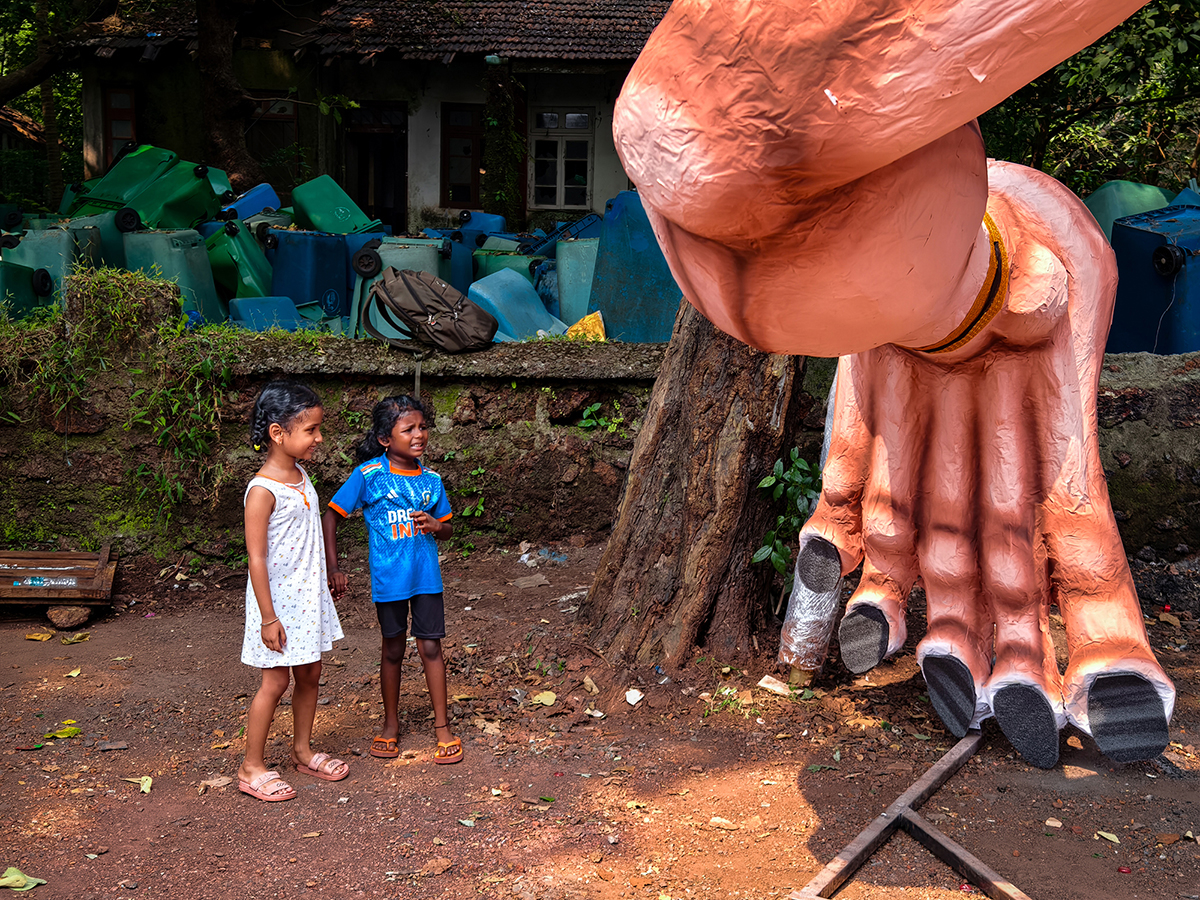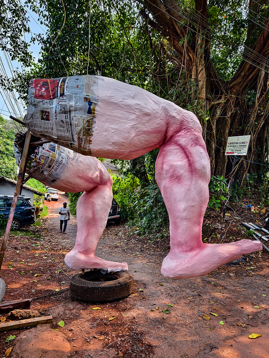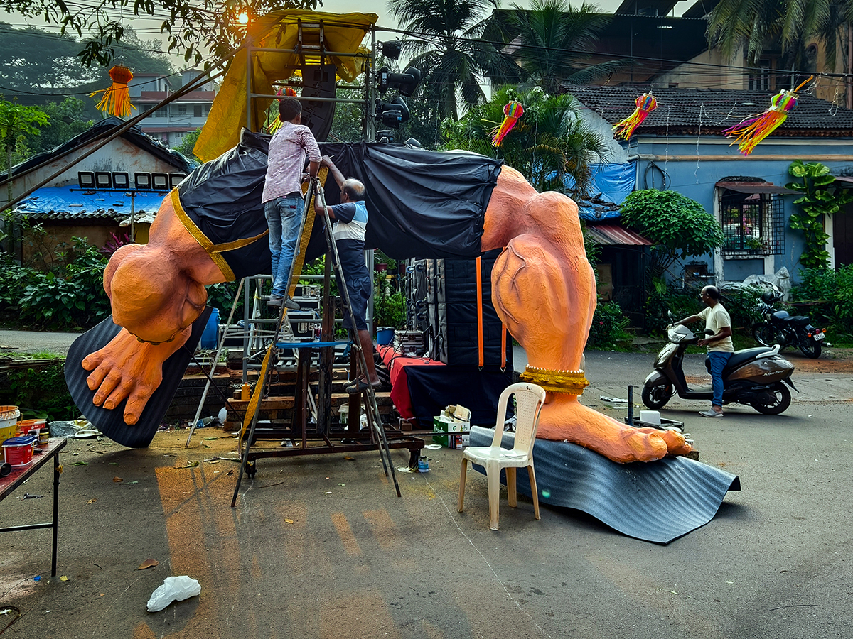 While cutting through a sleepy Goan village during the Narkasura festival, I suddenly found myself face-to-foot with the biggest toes I’ve ever seen. Enormous papier-mâché feet were casually lounging around like they owned the street,-some propped against houses, some sunbathing on the mud, others waiting for their shift on the demon’s body. It was one of those perfect street-photography moments where the bizarre appears without warning.