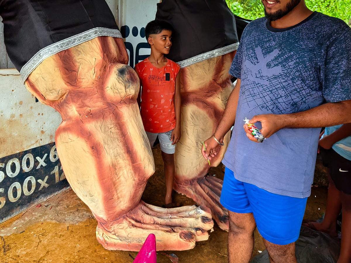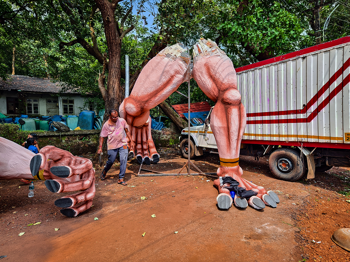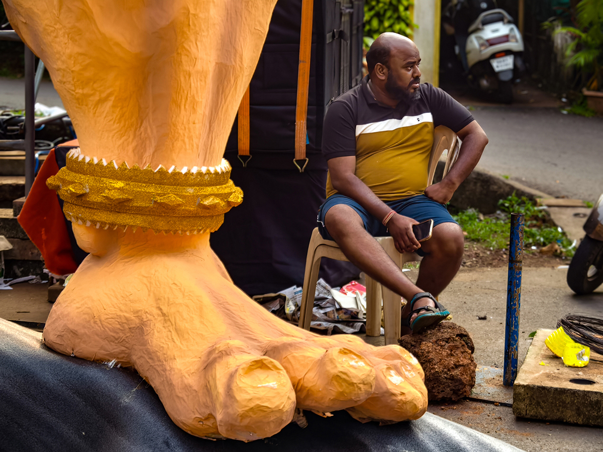 While cutting through a sleepy Goan village during the Narkasura festival, I suddenly found myself face-to-foot with the biggest toes I’ve ever seen. Enormous papier-mâché feet were casually lounging around like they owned the street,-some propped against houses, some sunbathing on the mud, others waiting for their shift on the demon’s body. It was one of those perfect street-photography moments where the bizarre appears without warning.