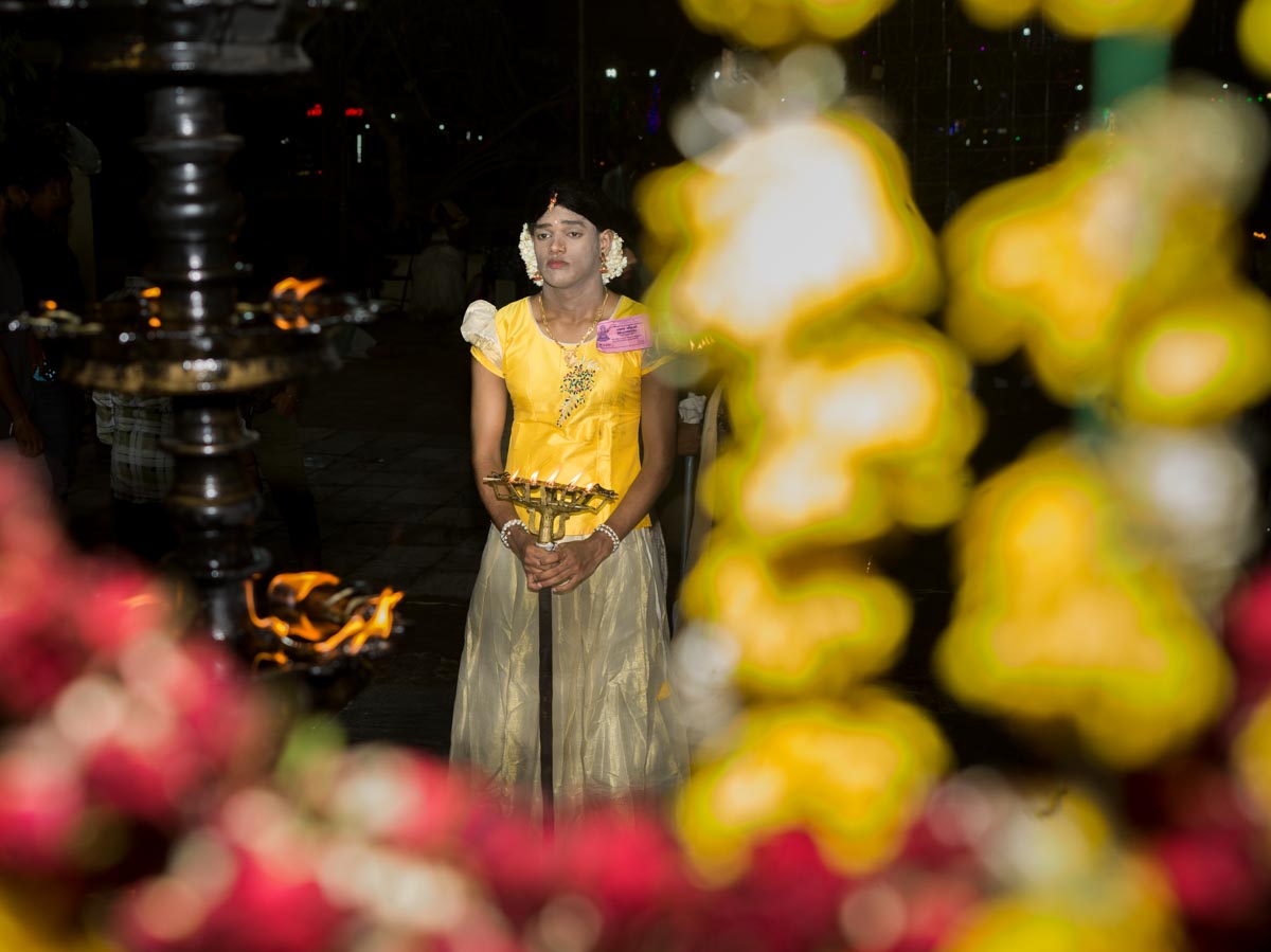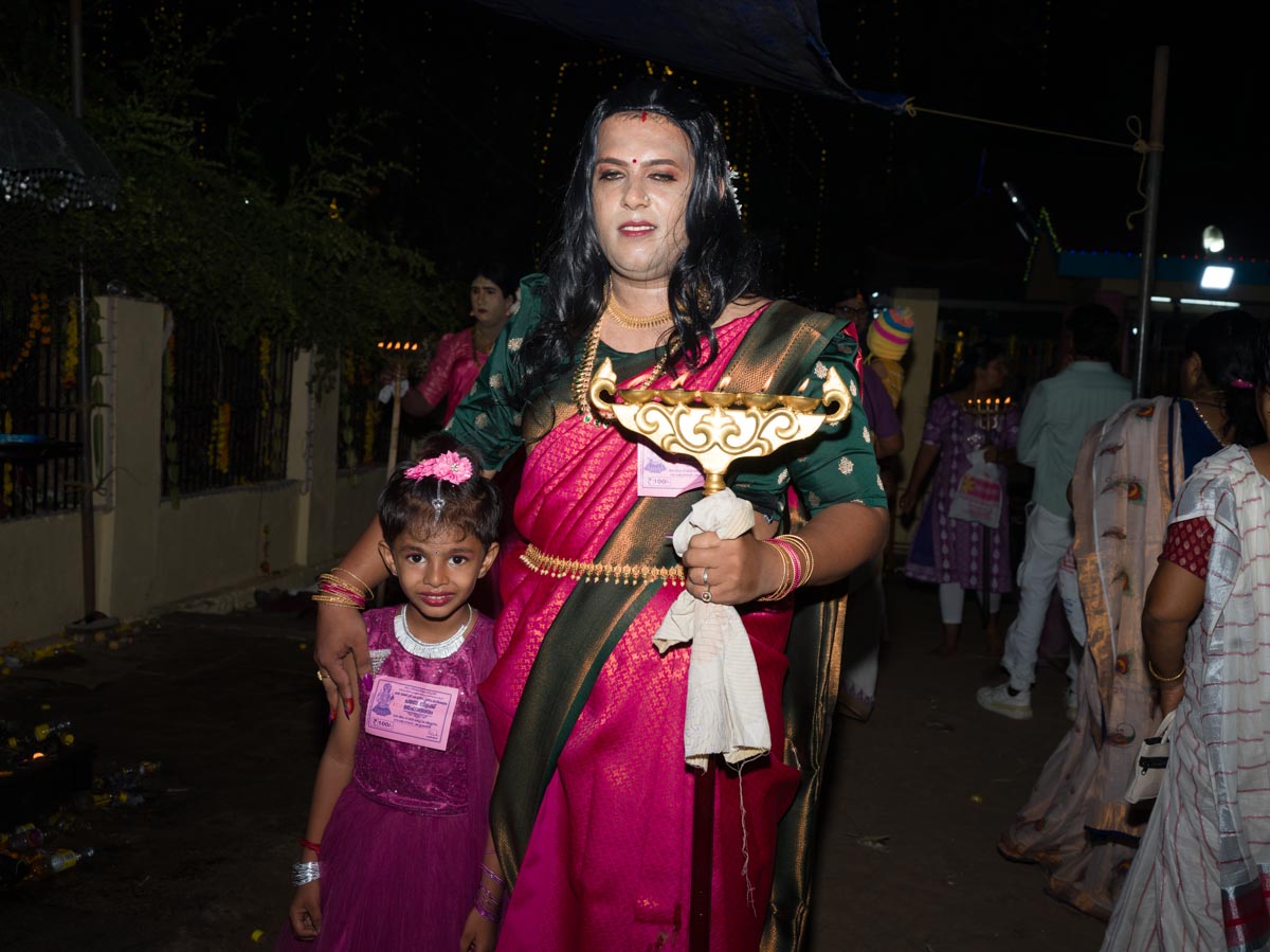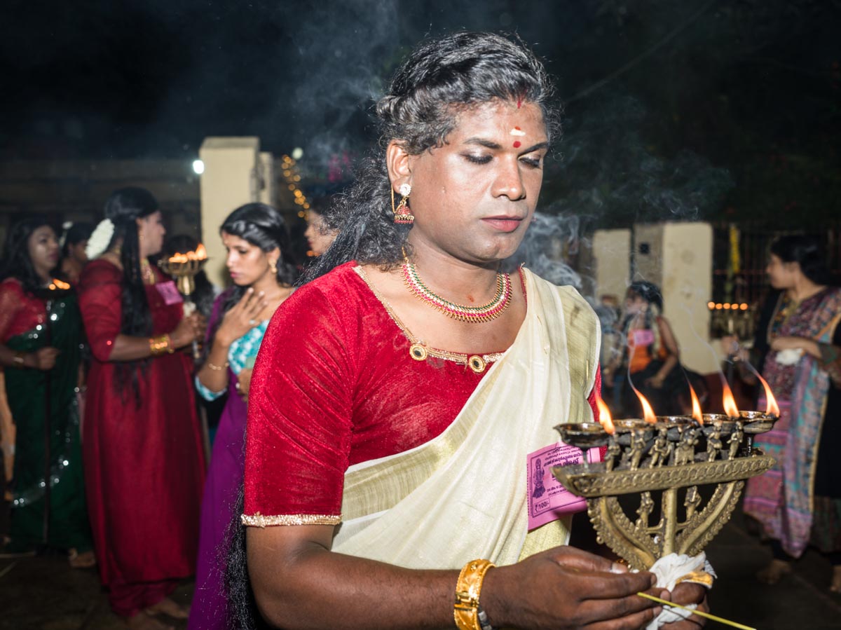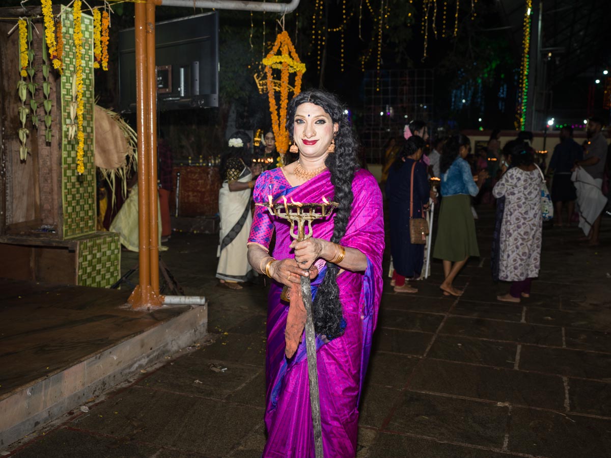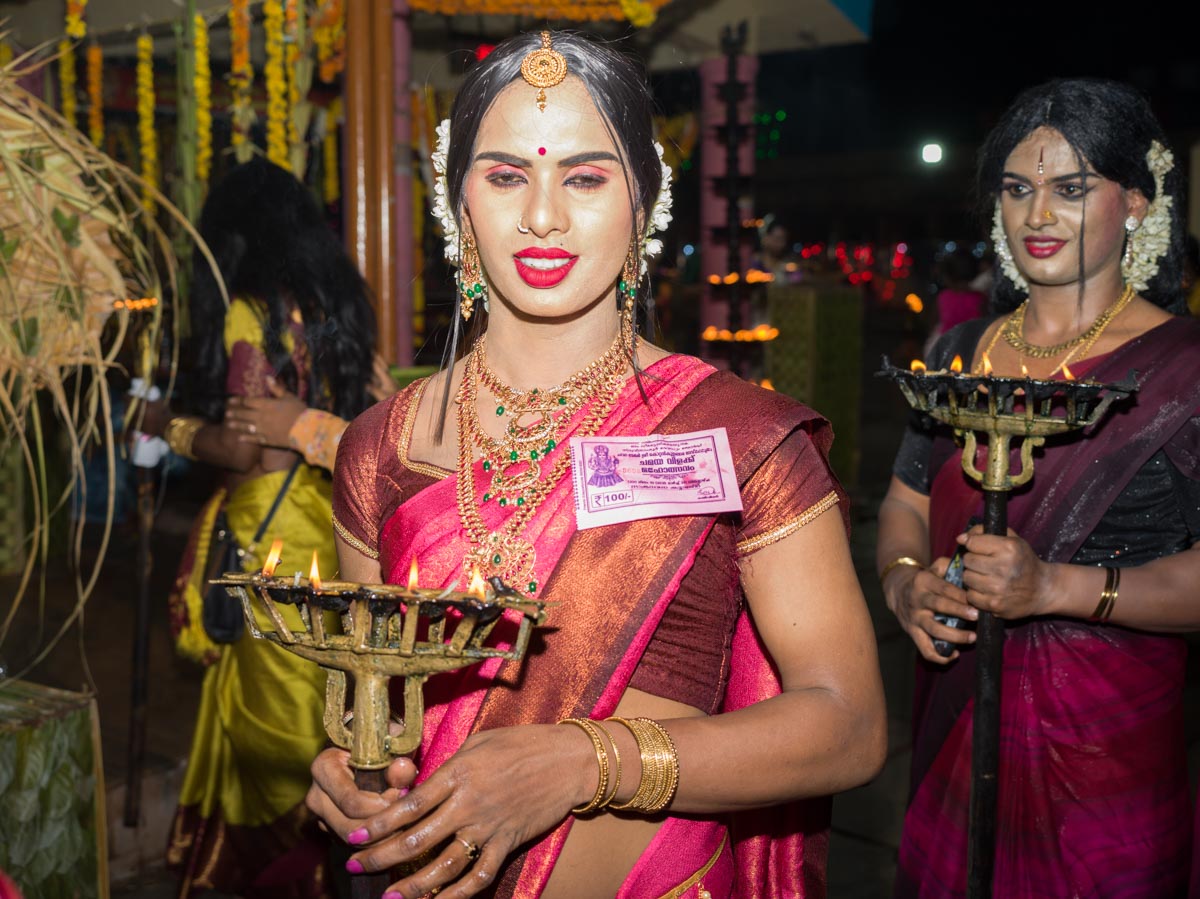 Kottankulangara Chamayavillaku festiwal is celebrated in Kerala, India, at the Devi Temple. The festiwal gathers thousands of men who dress up as beautiful women. Orchestras play, the crowd carries huge figures of gods, local artisans are building of the bamboo and coconut leaves the altar for the goddess. In the night, thousands of cross-dressed men walk barefoot to the temple with oil lamps offering wishes and thanks to the goddess, believing that the ritual brings fortune and success in life. The festival has also become a symbol of gender inclusivity for persons from LGBTQ community.