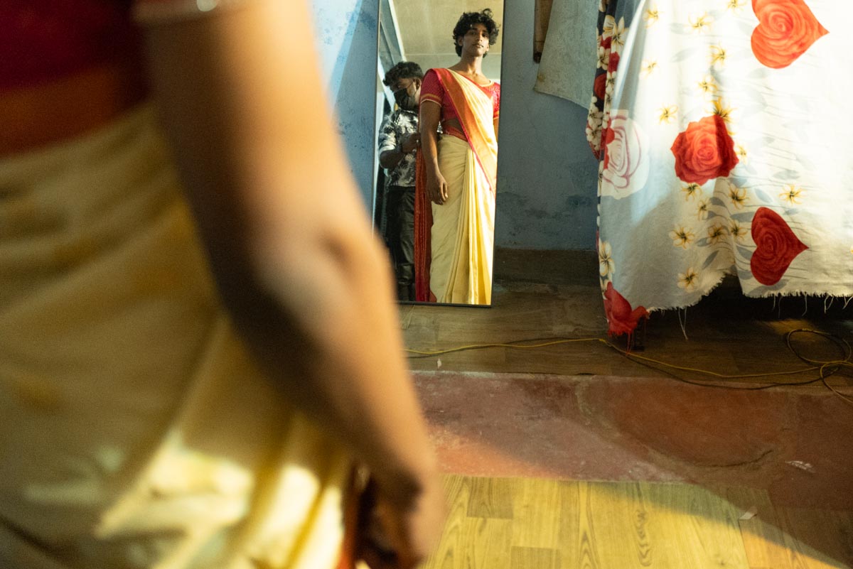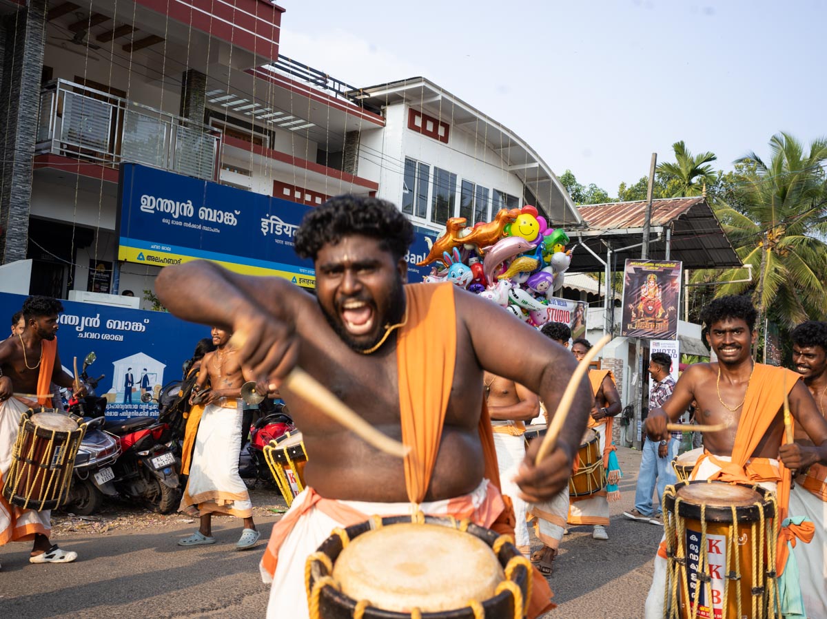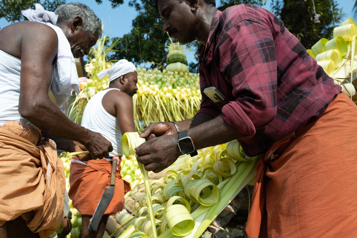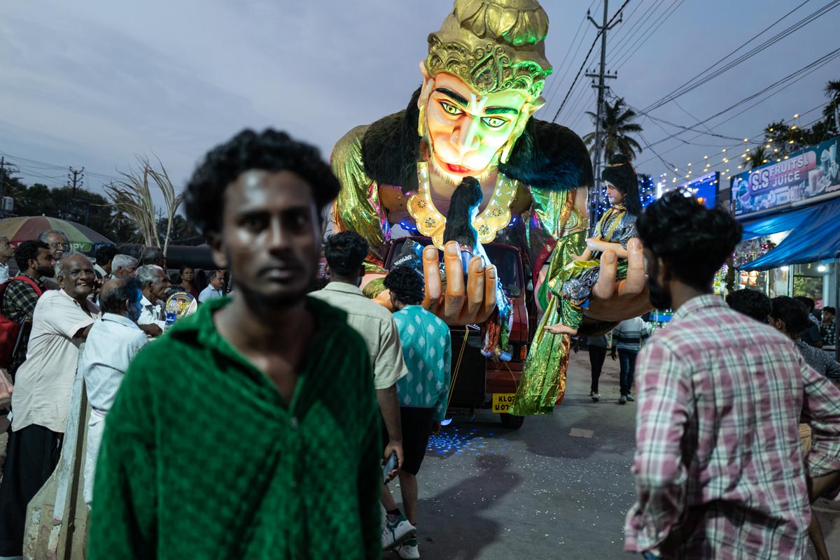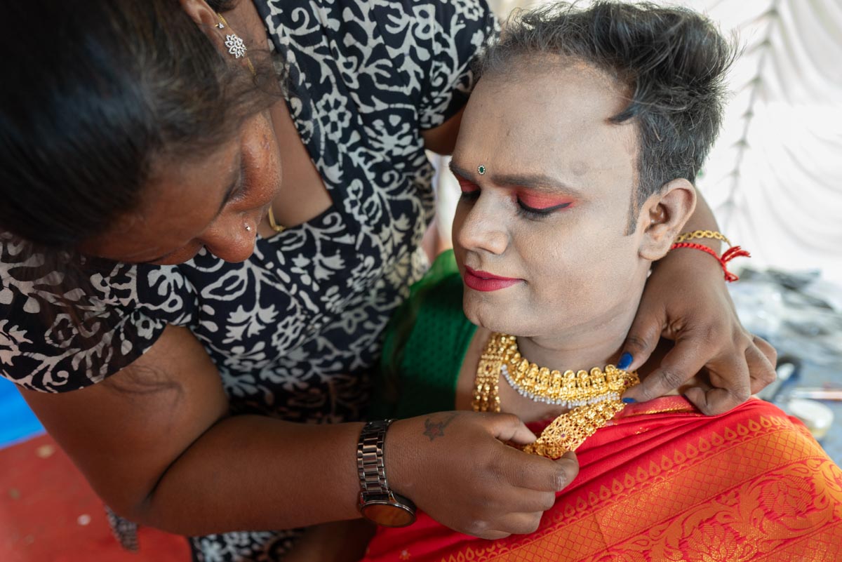 Kottankulangara Chamayavillaku festiwal is celebrated in Kerala, India, at the Devi Temple. The festiwal gathers thousands of men who dress up as beautiful women. Orchestras play, the crowd carries huge figures of gods, local artisans are building of the bamboo and coconut leaves the altar for the goddess. In the night, thousands of cross-dressed men walk barefoot to the temple with oil lamps offering wishes and thanks to the goddess, believing that the ritual brings fortune and success in life. The festival has also become a symbol of gender inclusivity for persons from LGBTQ community.