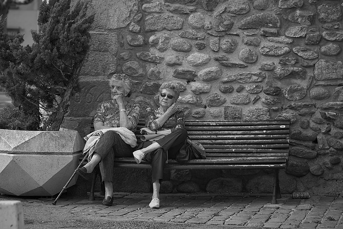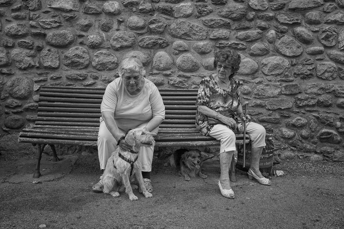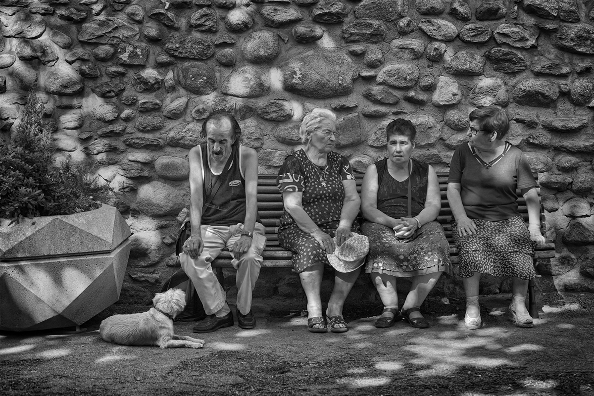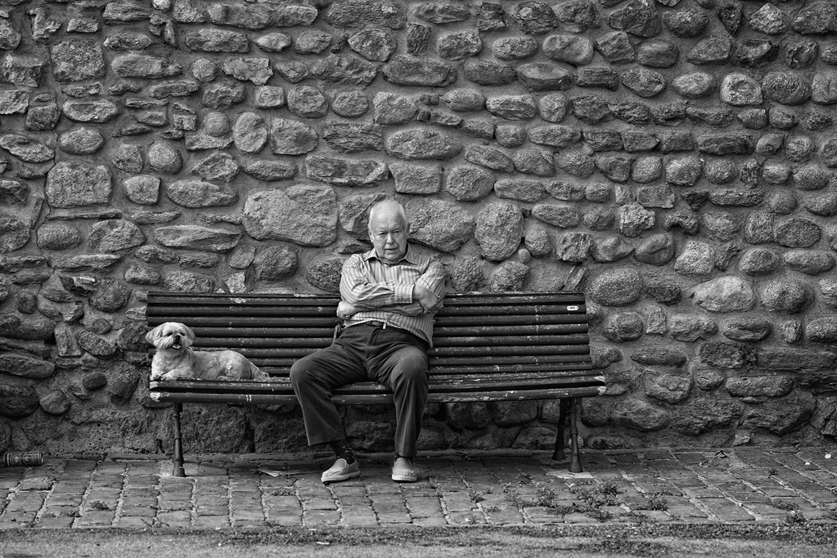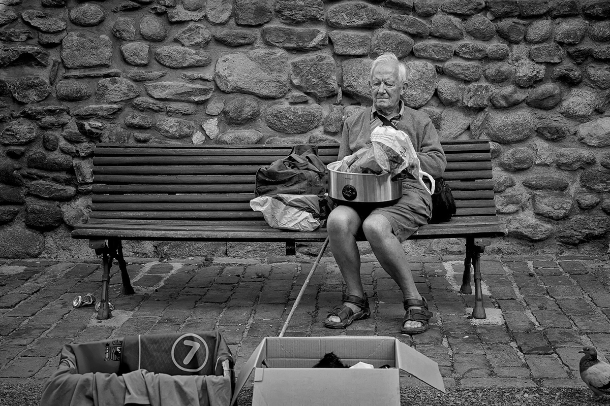 On weathered benches against stone walls, ordinary lives unfold in silence. Each image captures a fragment of human presence – a yawn breaking the still air, the quiet company of dogs, a lone figure sunk in thought, the weight of bags or the simple rest of folded arms. These are not grand gestures, but small moments that reveal the texture of existence: fatigue, companionship, resilience, and contemplation.