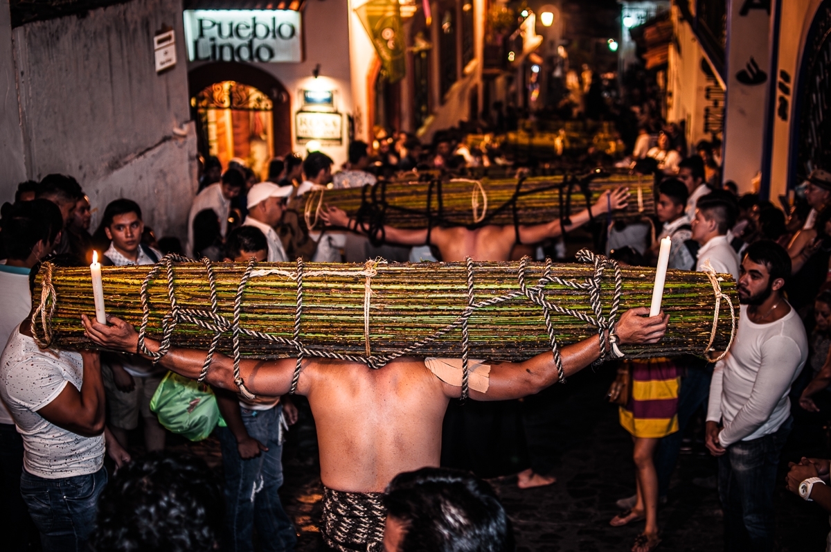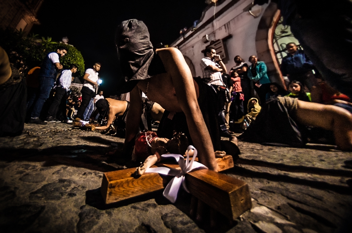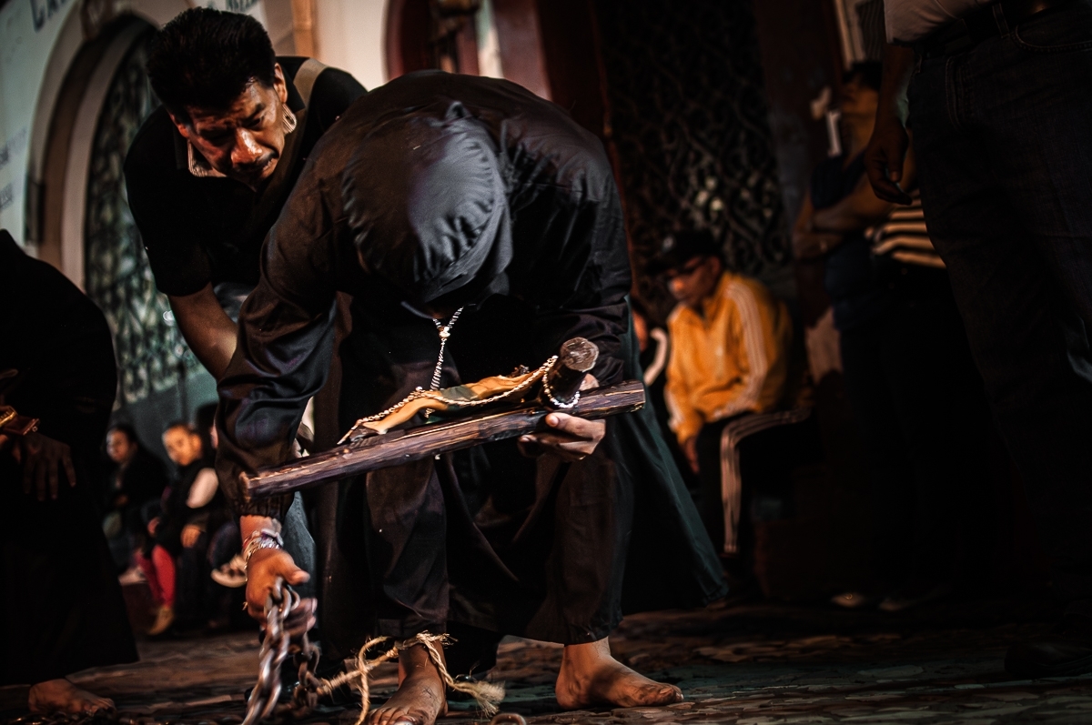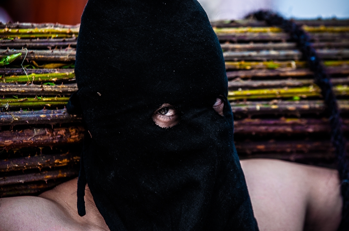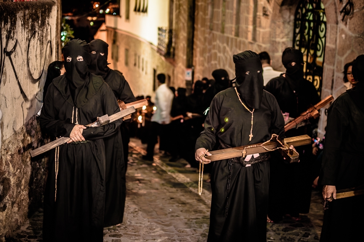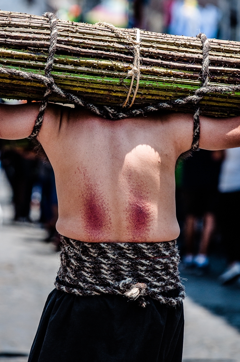 - La Hermandad de los Flagelantes: Sus miembros llevan el torso desnudo y sostienen al frente, con sus brazos, una pesada cruz de madera que puede alcanzar los 40 kg. Por momentos, se hincan para rezar y descansar, pero durante esas pausas se golpean la espalda con un objeto llamado "disciplina" que consiste un látigo con puntas de clavo. Este acto desgarra su piel hasta formar llagas sangrantes, pudiendo llegar a flagelarse hasta 63 veces en una sola pausa.