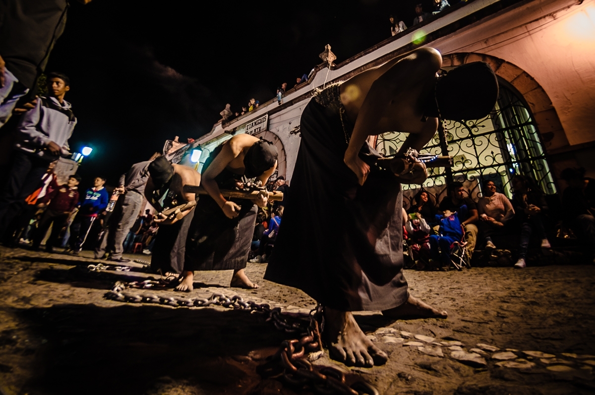 - La Hermandad de las Ánimas: Está conformada por mujeres que, caminando inclinadas o de rodillas, arrastran pesadas cadenas sujetas a sus pies y manos. A la procesión, por separado, se unen grupos de hombres que cargan imágenes sagradas, como el Cristo Siervo de Dios y a San Nicolás Tolentino.
