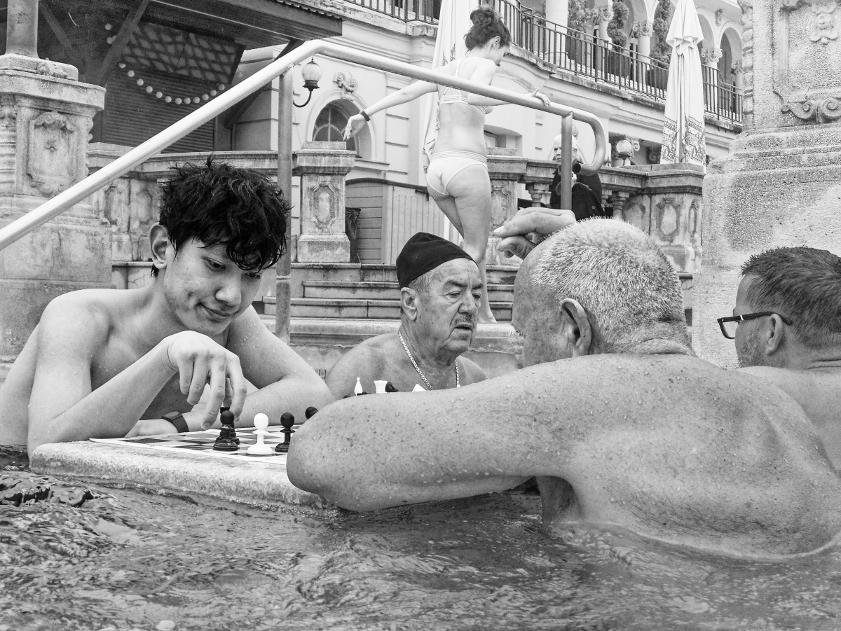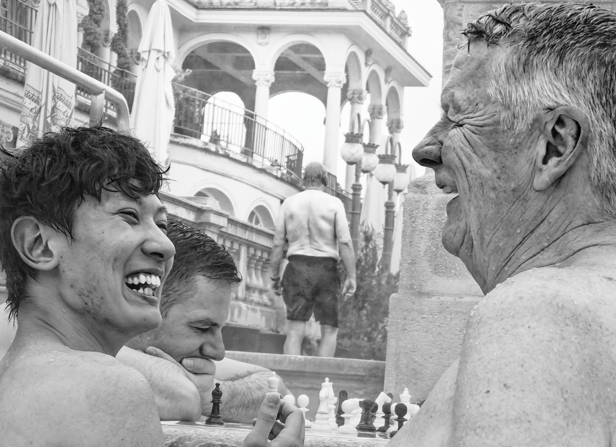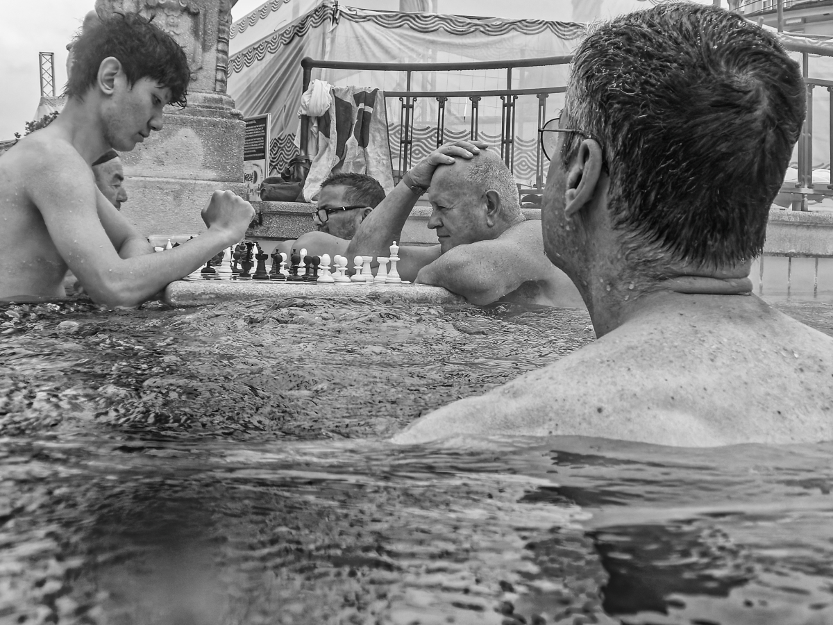 People play chess in the warm thermal bath. The young man wins, and the older one takes it easy.