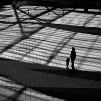 A mother and child walk lost in a web of shadows. From a high glass roof, the midday sun casts harsh shadows onto the ground, creating a powerful graphic pattern. The image symbolizes threat and loss.