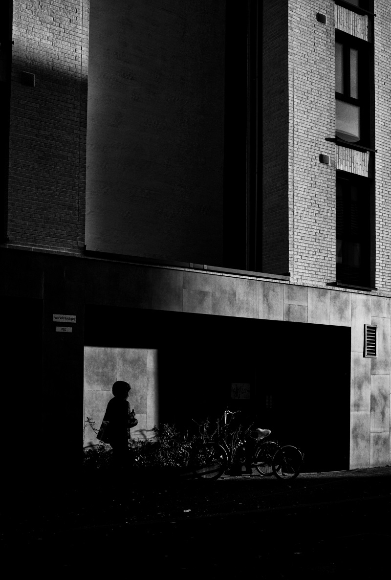 In this series, I explore the interplay of light and shadow in Cologne. The city does not appear as a tourist postcard image, but rather as a stage for contrasts, silhouettes, and fleeting encounters. People emerge like characters in a film noir – sometimes isolated, sometimes part of the urban geometry.