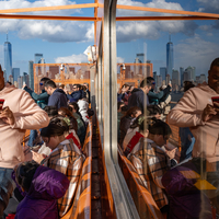Daily life scenes of commuters in the Staten Island Ferry, a fare-free passenger ferry route operated by the New York City Department of Transportation. April 2025.