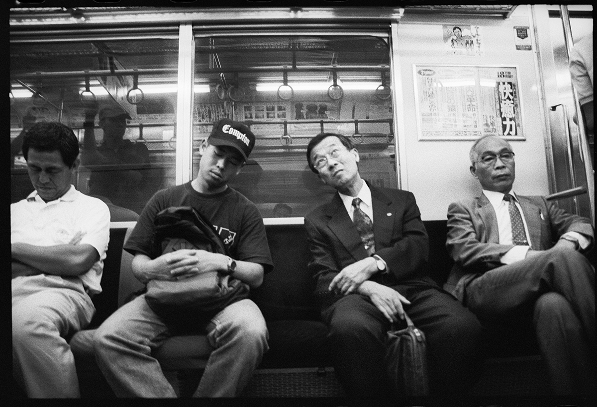 This series began as a student’s exploration of Japan in the mid-1990s, a moment shaped by the “Lost Decade” and the lingering unease following the 1995 subway sarin attack. Shot on black-and-white film, the photographs follow the understated choreographies of everyday commuters—glances, gestures, and the small acts of retreat that shape public life.