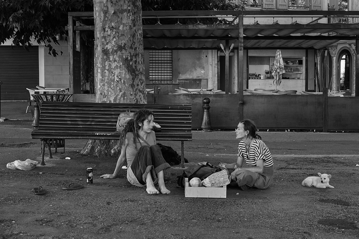 On weathered benches against stone walls, ordinary lives unfold in silence. Each image captures a fragment of human presence – a yawn breaking the still air, the quiet company of dogs, a lone figure sunk in thought, the weight of bags or the simple rest of folded arms. These are not grand gestures, but small moments that reveal the texture of existence: fatigue, companionship, resilience, and contemplation.