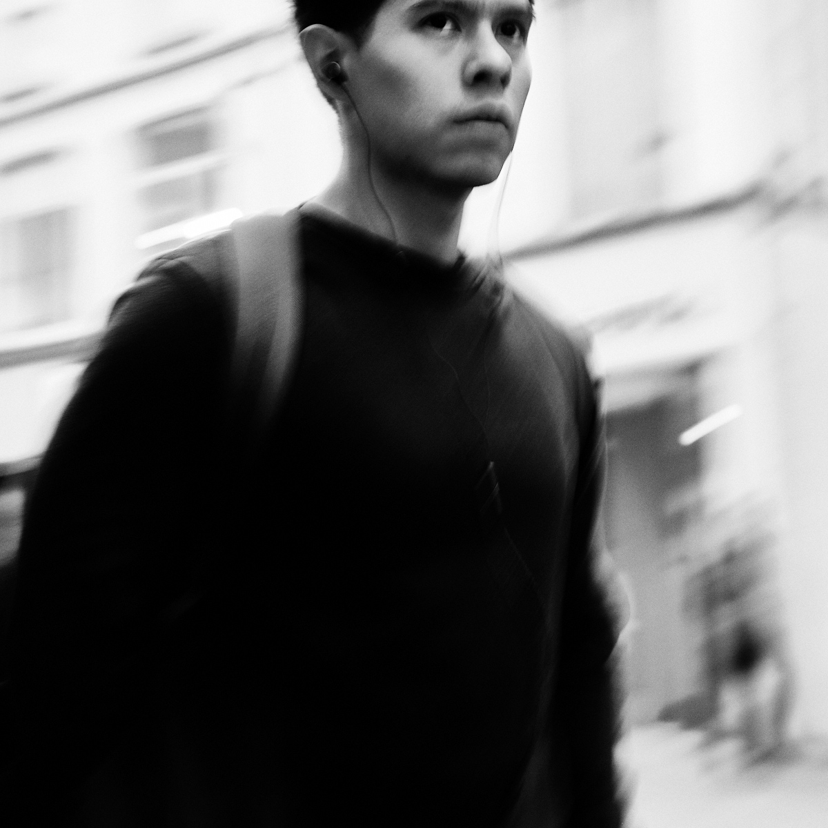 The formal language performs this split through compression (invasive closeness, hard contrast) and dissolution (motion blur, spectral figures, optical erasure). These alternate across the sequence, mirroring how I self-regulate in public - momentary alertness followed by inward retreat.